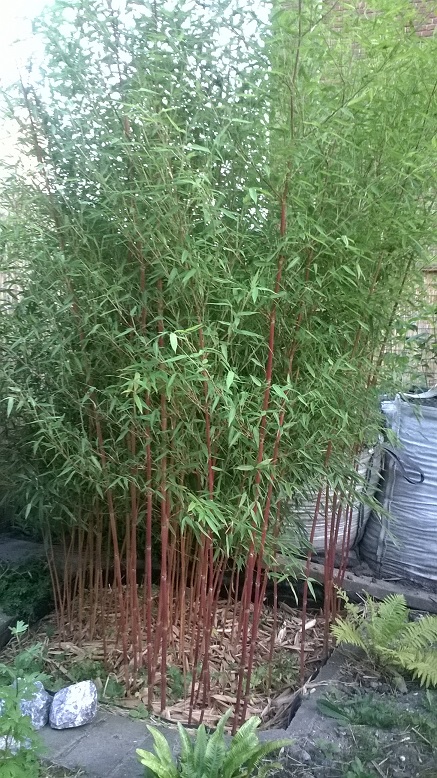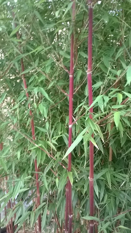 Ph. aureosulcata aureocaulis heeft veel scheuten gemaakt en ze zijn ook dikker en hoger. Met zoveel nieuwe groei lijkt de naam purpurea (rood) momenteel gepaster dan aureo (geel). Deze bamboe moet samen met de Musa's en de Gunnera voor een overweldigen effect gaan zorgen bij binnenkomst via de tuindeur. De Musa's waren al hoog, de bamboe begint nu flink volume te krijgen maar kan nog dubbel zo groot worden. En dit jaar doet de Gunnera tinctoria al flink zijn best, maar volgend jaar hoop ik de manicata aan te kunnen planten. Ik kijk er erg naar uit.