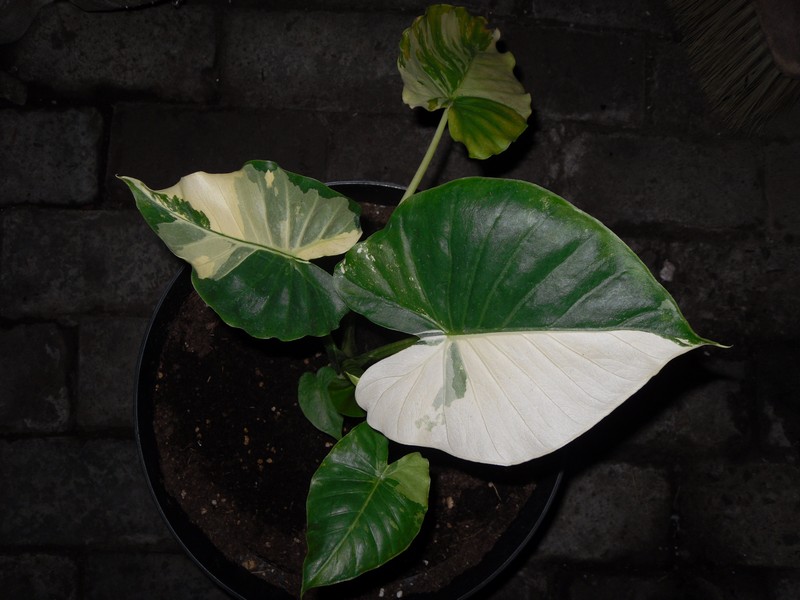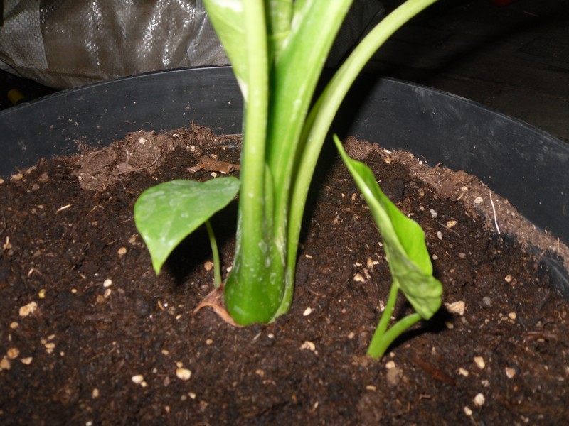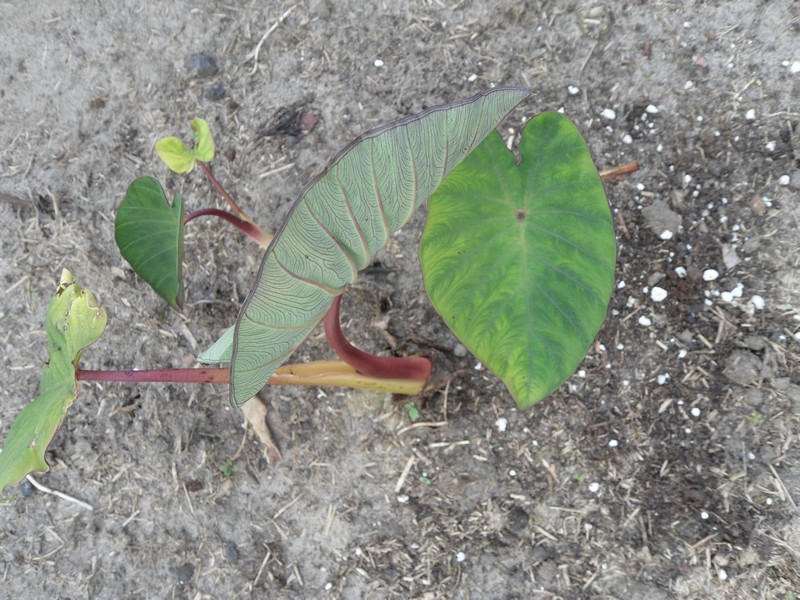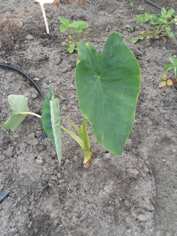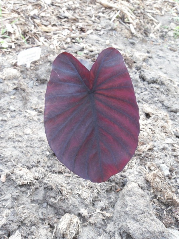 De Colocasia 'Jacks Giant' heeft een 30cm groot blad geopend, laat ons hopen dat hij gaat knallen (a) .