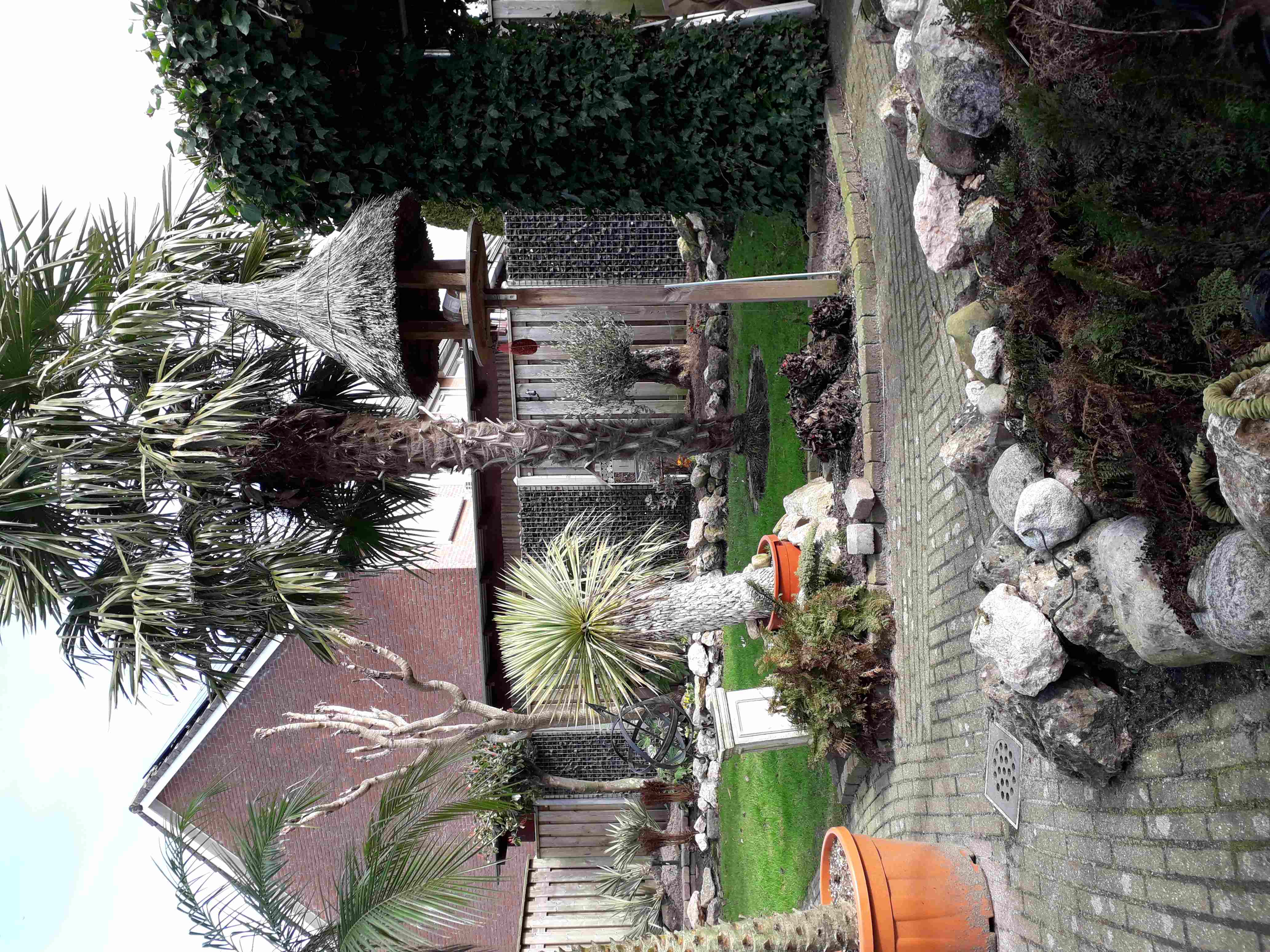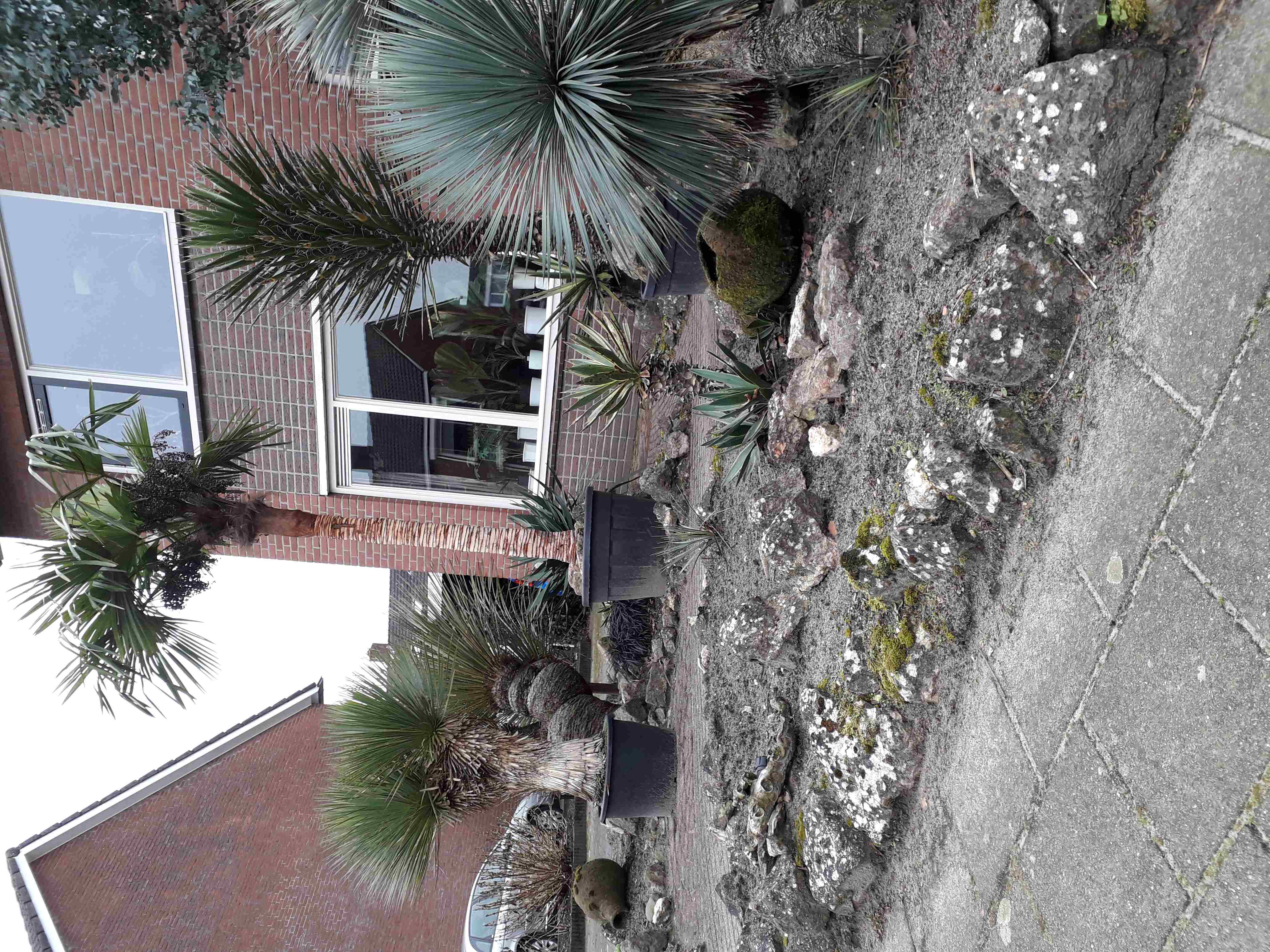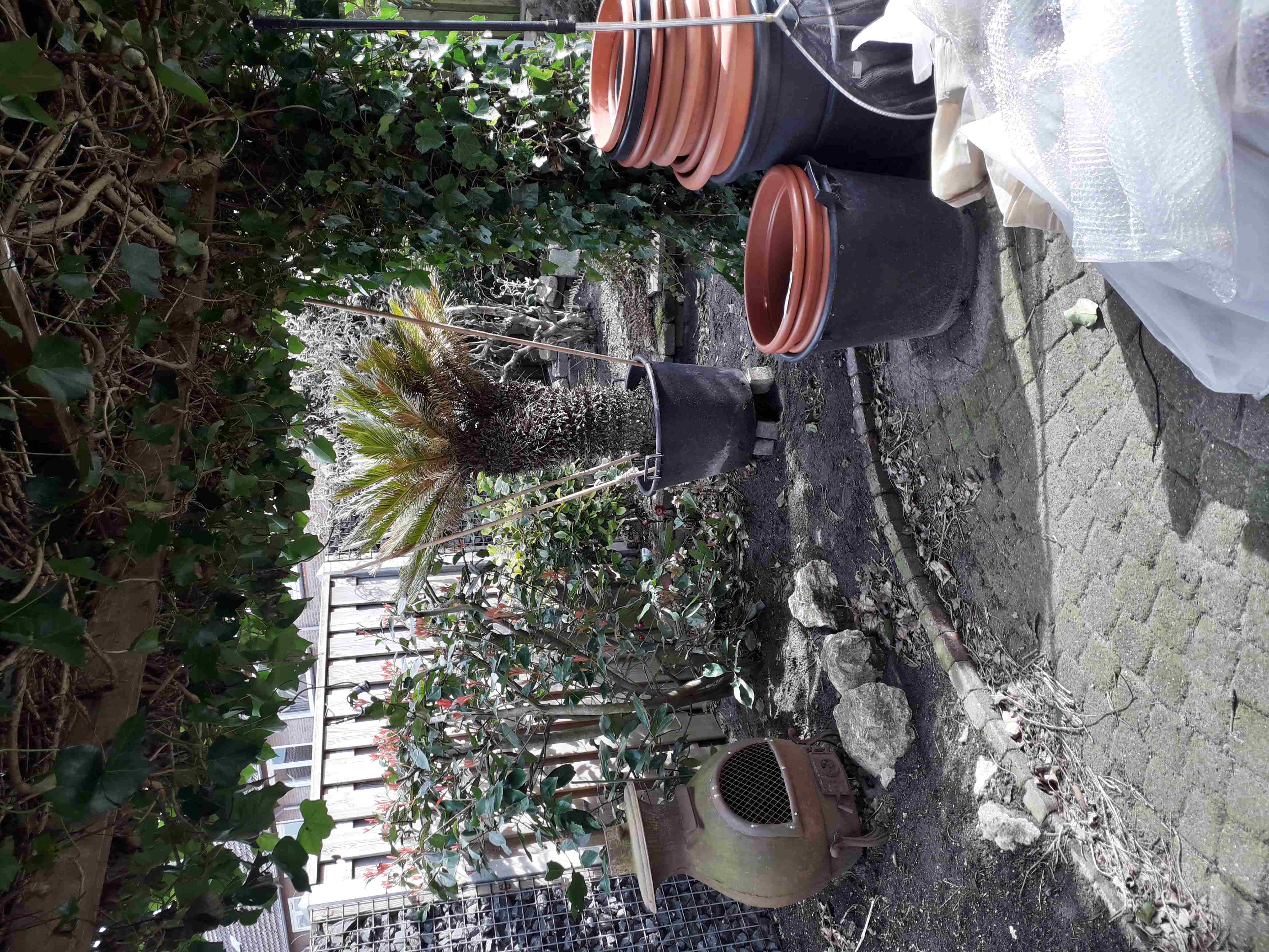 Zelf geen echte ervaring mee, ik kan me voorstellen dat T. campestris hier niet heel blij van word; is een palm die liever erg droog staat.
