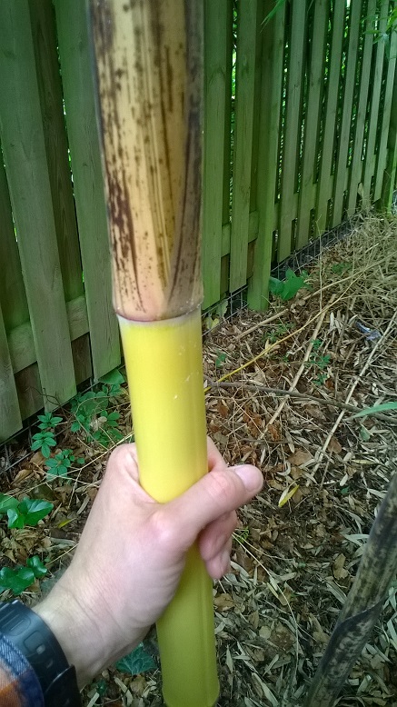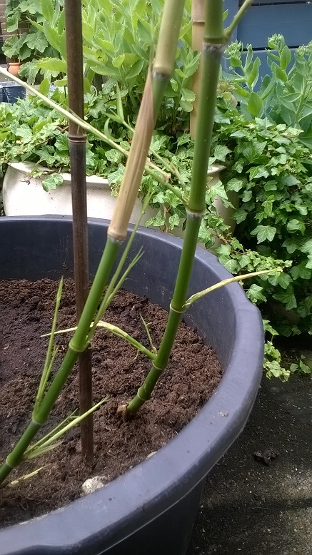 Het grootste blad is nu 80 cm. breed. Niet slecht in 3 maanden vanuit een knop. Hij was wel wat bleek tussen de nerven ondanks mest. Dus ik heb hem nu wat extra "supergroen gazonmest" van Pokon gegeven (met veel stikstof, magnesium en ijzer). Ik ben benieuwd hoe groot hij in 1 seizoen wordt. En nog meer naar hoe het er uit ziet als hij straks over de schutting steekt. En of dat niet wat te gek wordt qua overstekend groen over het voetpad.