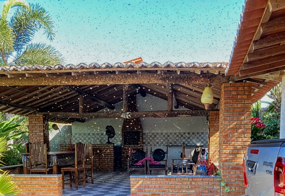 Na 5 dagen niet in de veranda kunnen komen zijn we gisteren eindelijk verlost. Een bijen nest had zich tussen het dakbeschot en de muur van de veranda gevestigd. De beestjes zijn vertrokken en zijn hoogst waarschijnlijk nu ergens anders een nieuw nest aan het maken :lol: Door een professioneel team met rookmachine is het nest verwijderd en de ruimte tussen het dakbeschot en de muur is dicht gemaakt, zodat er zich geen nieuwe kolonie kan vestigen. De honing uit het nest is geoogst en was heerlijk ;)