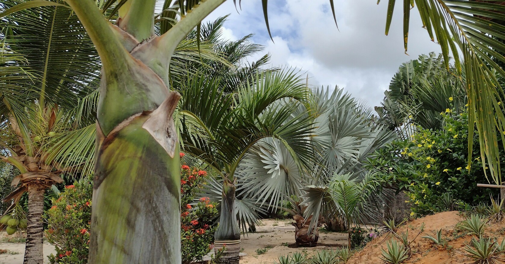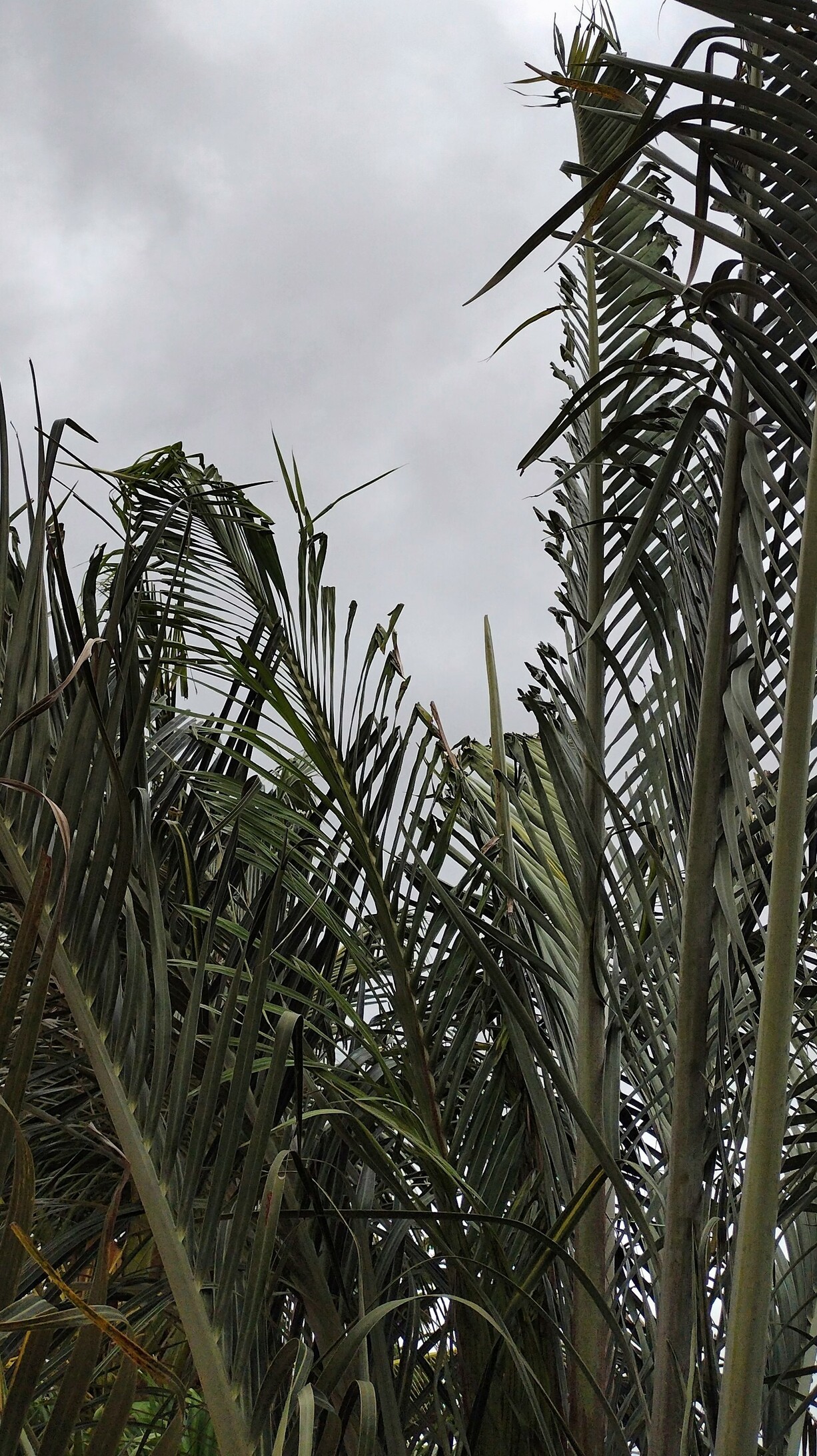 Foto nummer 3,4 en 5 van de ernstig vervormde palm, zowel stam als blad. Je ziet duidelijk dat de bladvoeten in alle richtingen wijzen en steeds ten opzichte van elkaar verdraaien. Ook het blad op foto #5 is volledig verfrommeld.