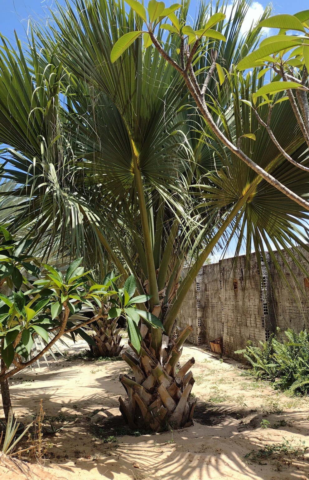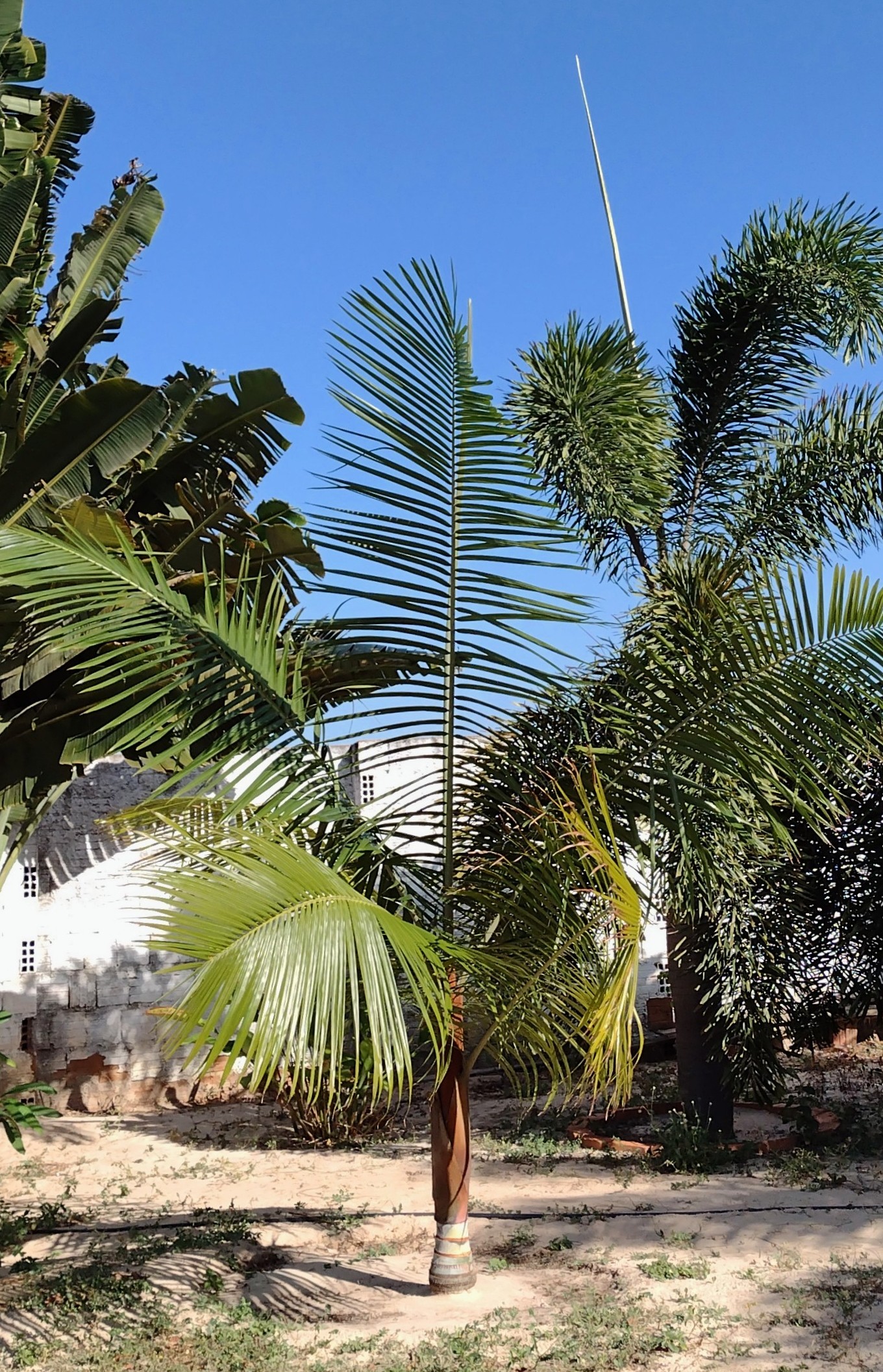 Sabal causiarum, het worden monstertjes. Ik schat bijna 5 meter hoog nu. Om een indicatie te geven; muur er achter is 2,10 m hoog ;)