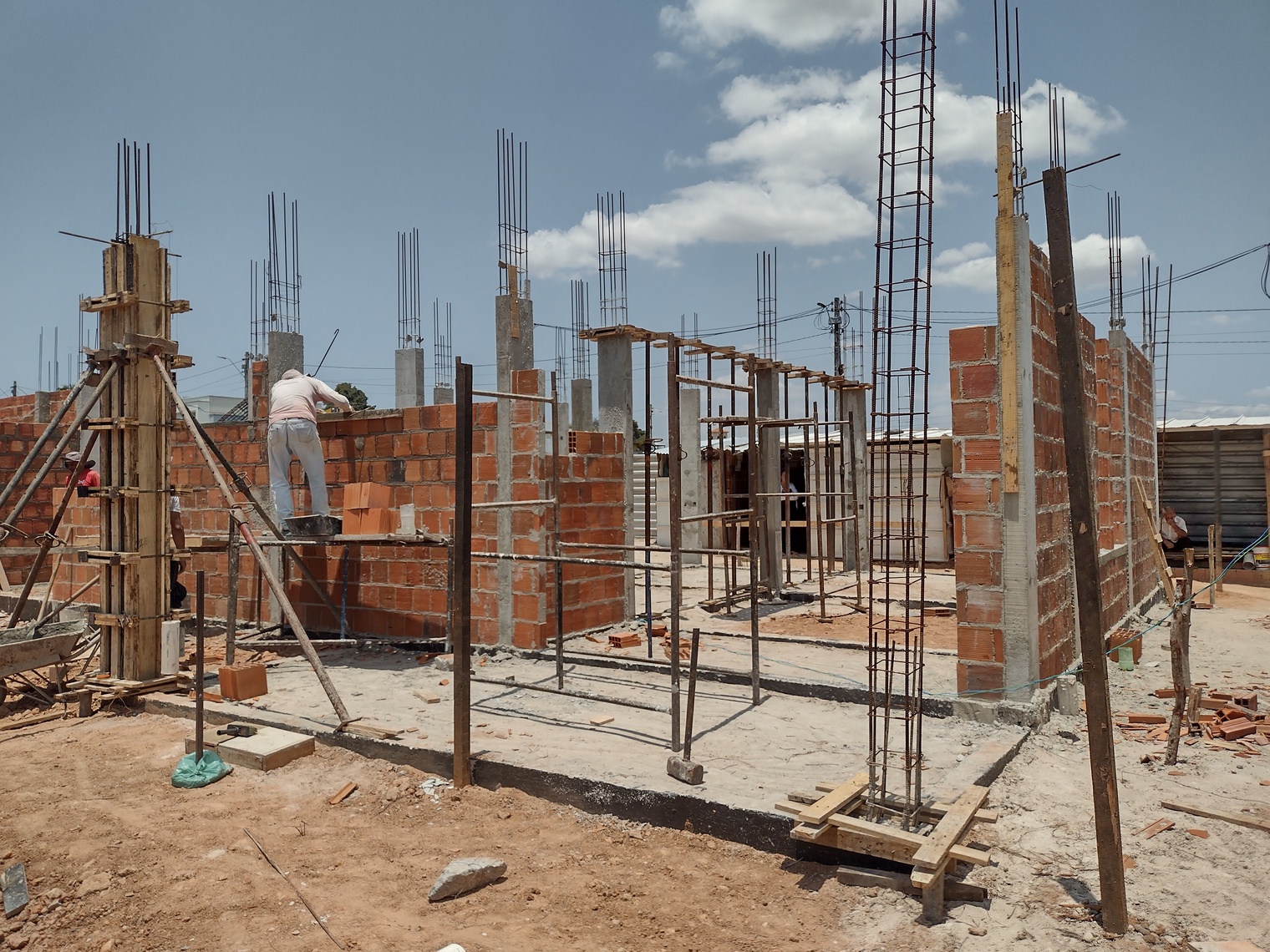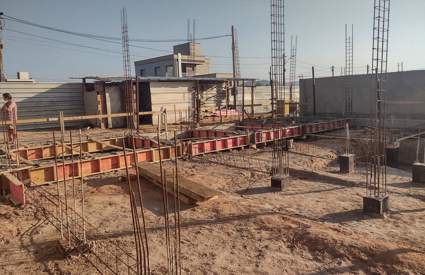 Ongeveer de helft van de kolommen voor de benedenverdieping zijn gemaakt. Volgende week de andere helft en dan kunnen de binnen en buiten muren voor de begane grond gemetseld worden.