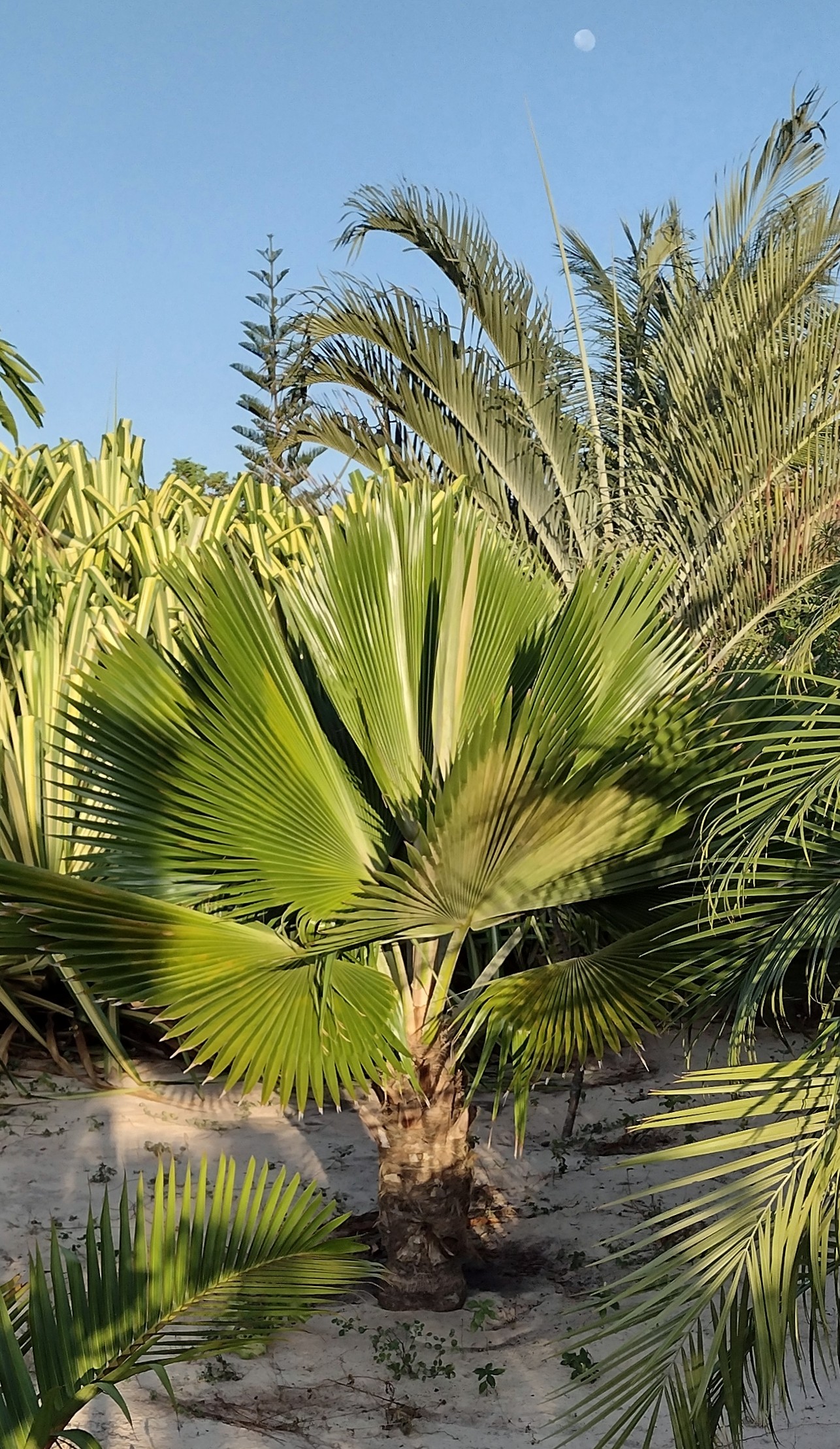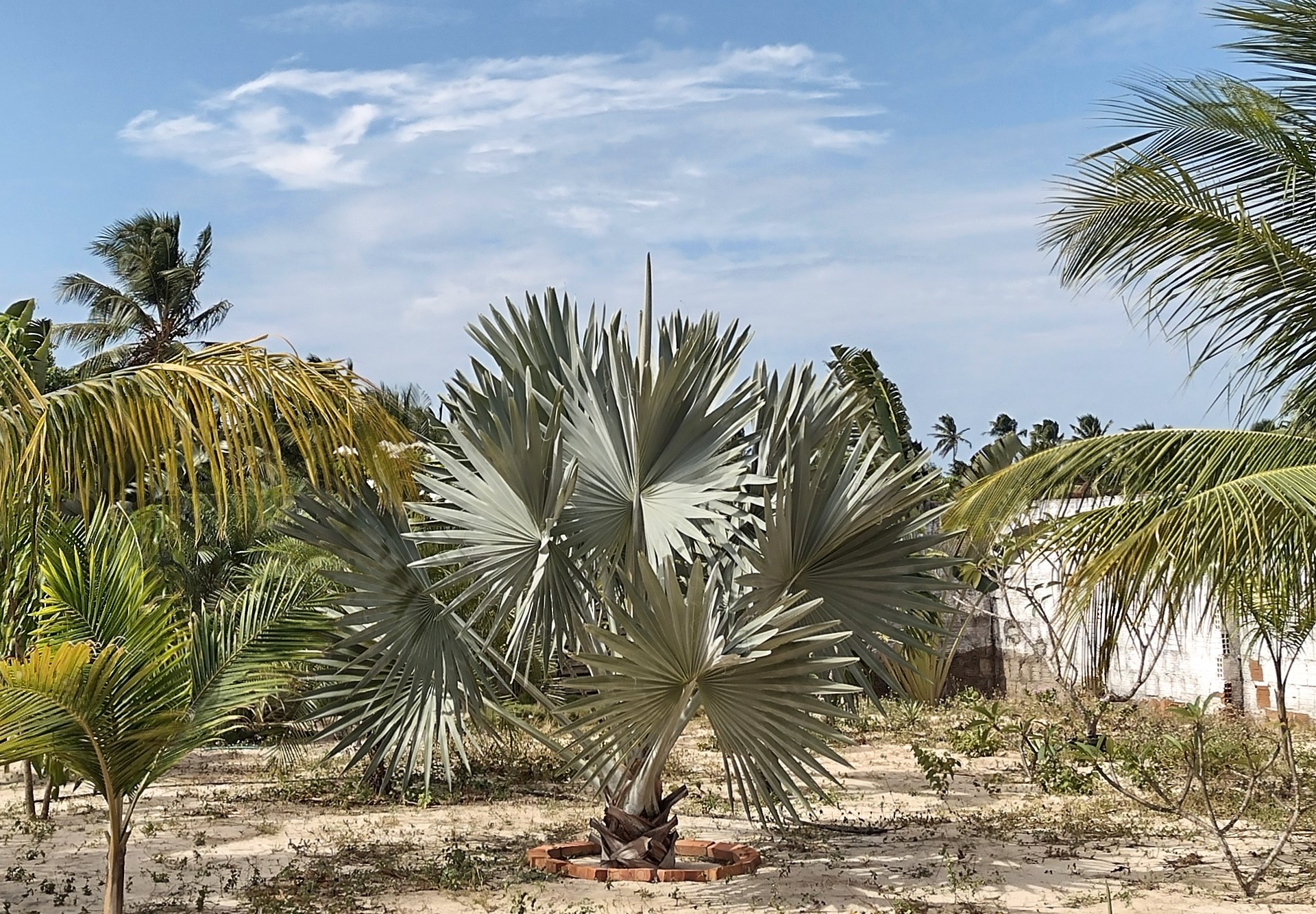Stammetje Sabal Causiarum is ongeveer 2 meter hoog en een meter breed. Begin dit jaar kon ik als ik op me tenen ging staan nog de dikke nieuwe speer voelen. Kan er nu niet meer bij