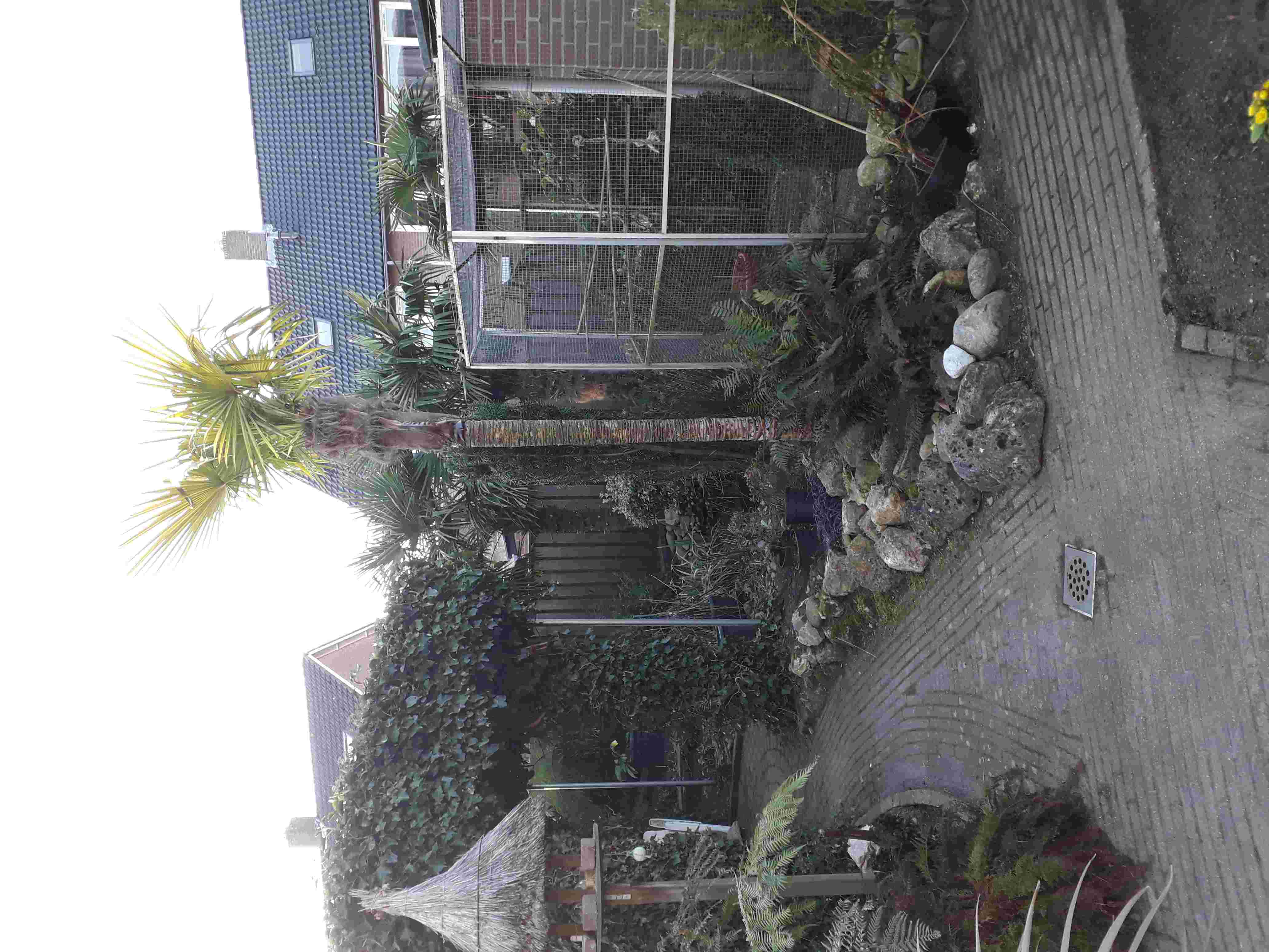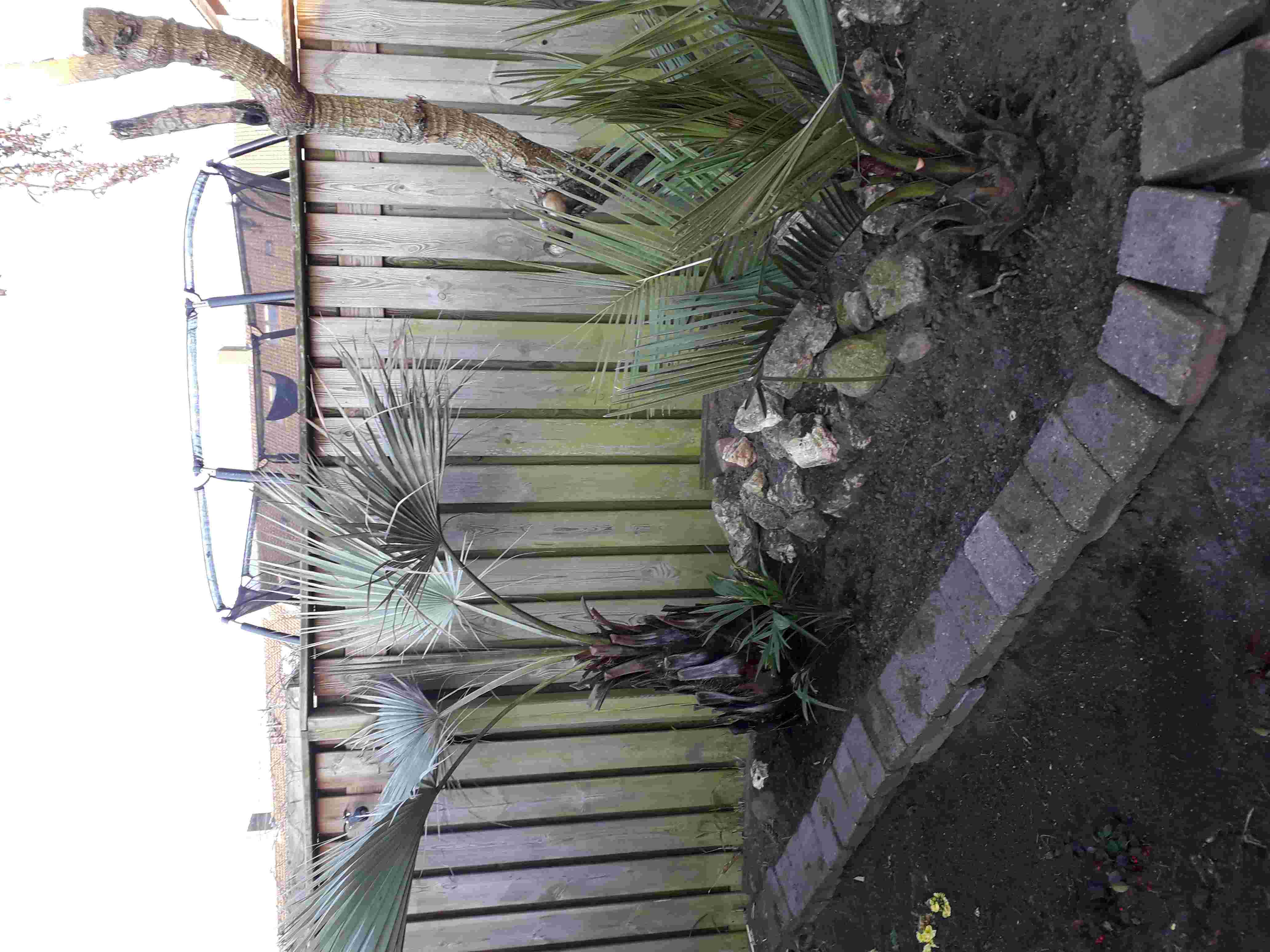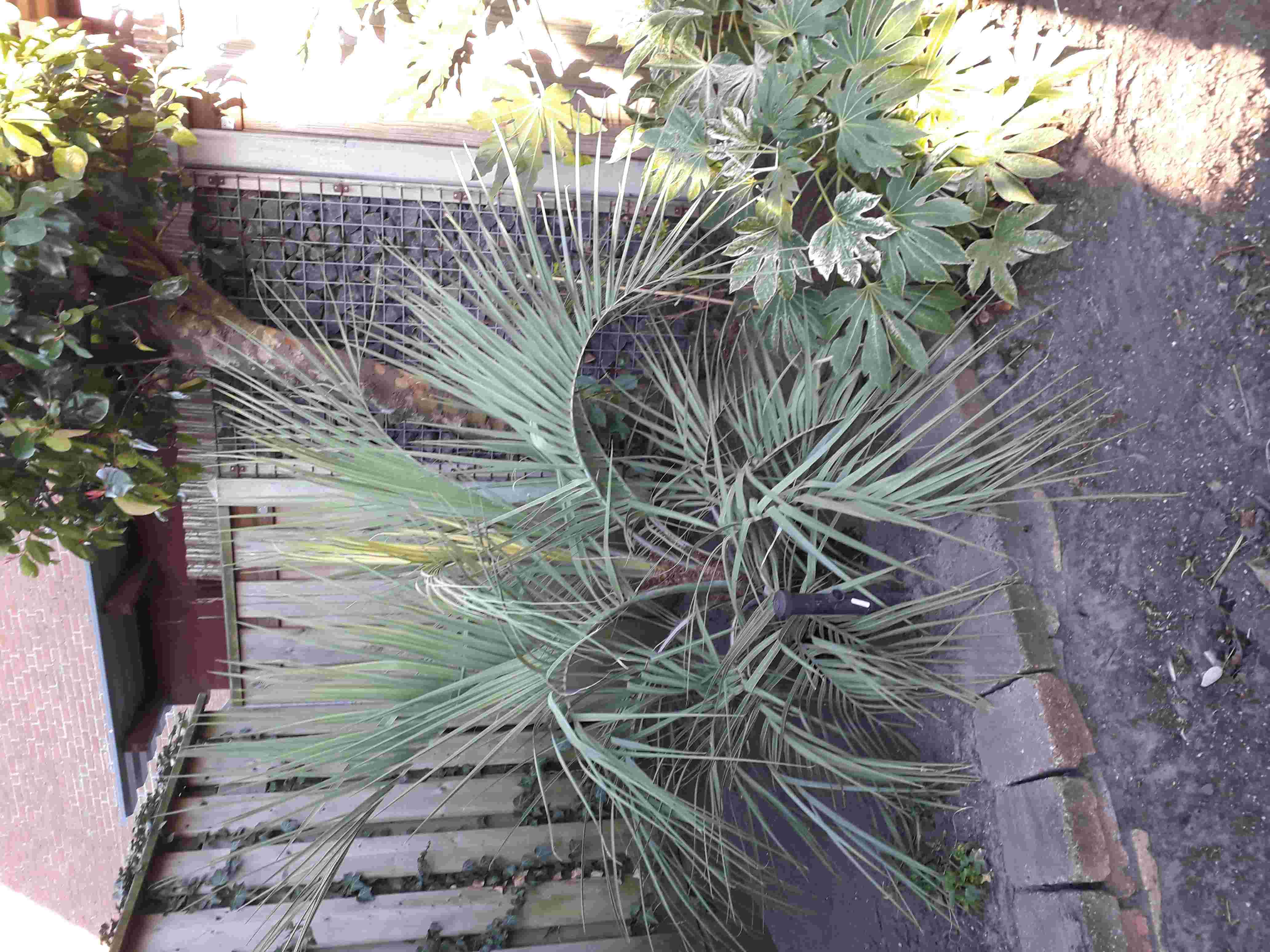 Marinus, die gestripte Trachycarpus staat er wat verkommerd met zijn gelige bladeren. Staat die in een kuip? De palm kan volgens mij wel wat extra voeding gebruiken of een grotere kuip? In de grond is natuurlijk het beste.