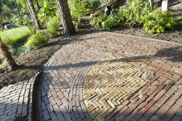 ons nieuwe terras met 4 verschillende stenen en een leuk motief