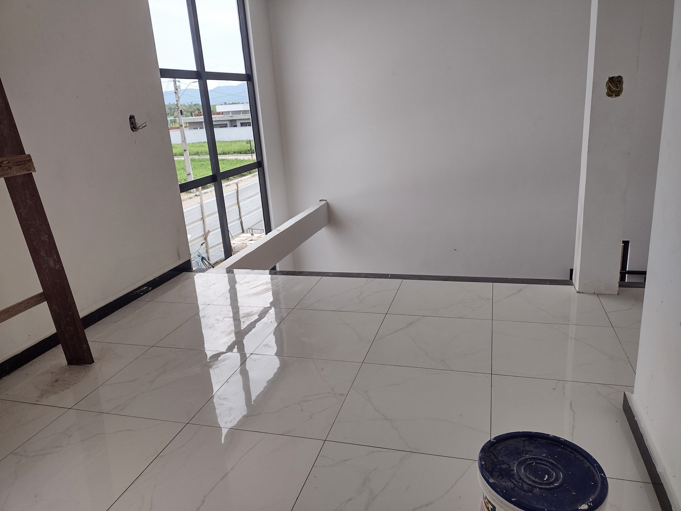 Vanaf nu gaat het hard, eind volgende week zit overal dubbellaags spiegelglas in de kozijnen, een subtiel groene tint en het spiegeleffect in het glas zorgt ervoor dat 85% van de uv straling geweerd wordt en dat het huis koel blijft.