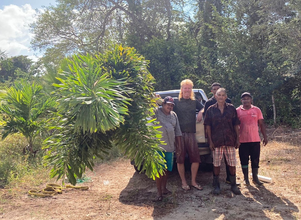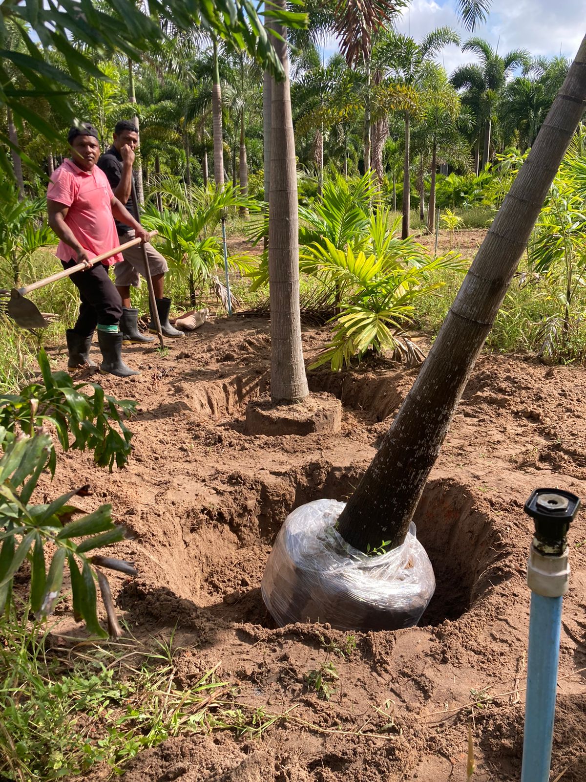 De foto's doen de kluiten kleiner lijken dan ze in werkelijkheid zijn. Beiden zijn loodzwaar en staan in een plantgat van ongeveer 70 a 80 cm diep. Vanaf eind augustus tot +/- december staat hier dagelijks een stevige wind maar ze hebben nog geen krimp gegeven. Wel zijn de oudste 3 veders van beide palmen al verdroogd, iets wat ik ook wel te verwachten was. Over het algemeen duurt het hier wel een paar maandjes tot dit formaat van zo'n verplaatsing hersteld.