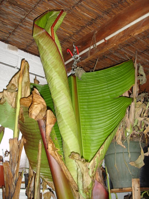 de bananen moet ik nu voor de 3e keer een stuk inkorten,die blijven maar groeien,ze zijn enkel stil gevallen tijdens de 2 weken strenge vorst toen was het in de garage 6 graden