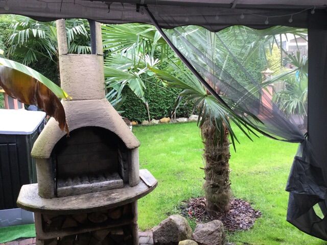 Vanaf lounge-hoek uitzicht op een harige stam! In de zomer maak ik regelmatig de stam nat met koud water. Dit om een grotere stam omtrek te creëren. Ik haal mijn informatie ook maar via internet :D