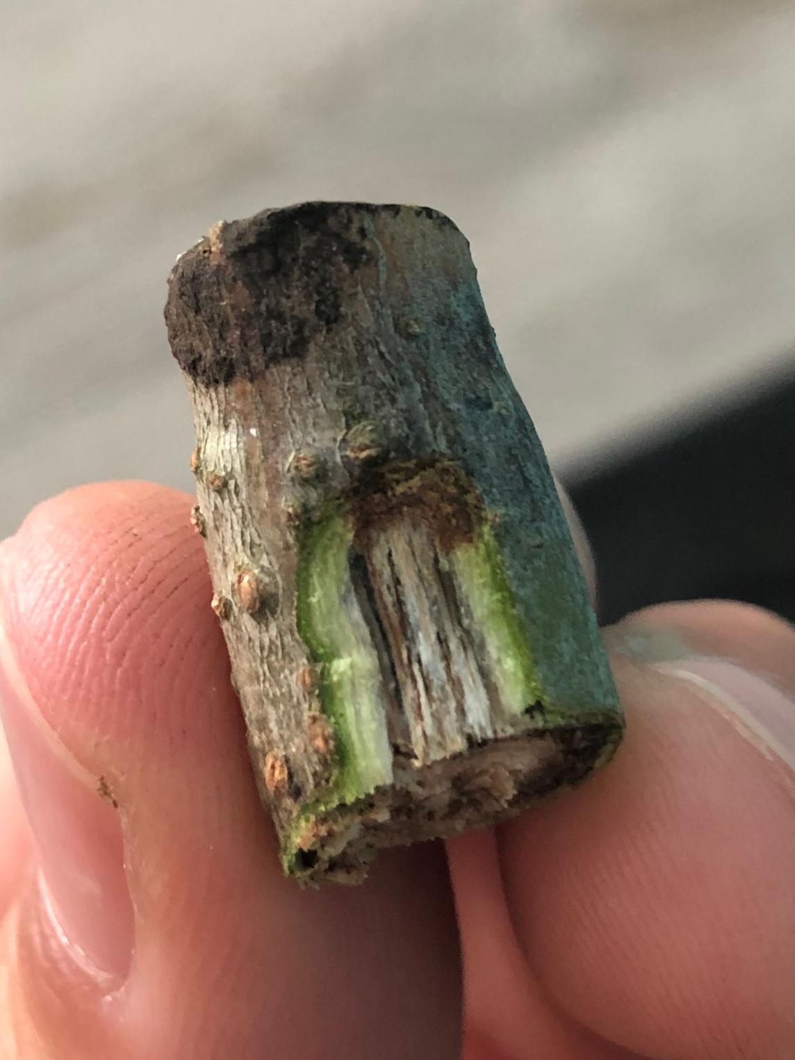 Nee het zwarte was door de gehele stam te vinden, deze Albizia was geheid dit jaar gestorven, zo niet volgend jaar en op het moment van sterven was deze wel besmettelijk geweest. Niet leuk maar goed , uit het oog uit het hart en snel vergeten. Gelukkig de andere Albizia niet aangedaan en dat dit een mooie boom mag worden. Bedankt voor het duimen
