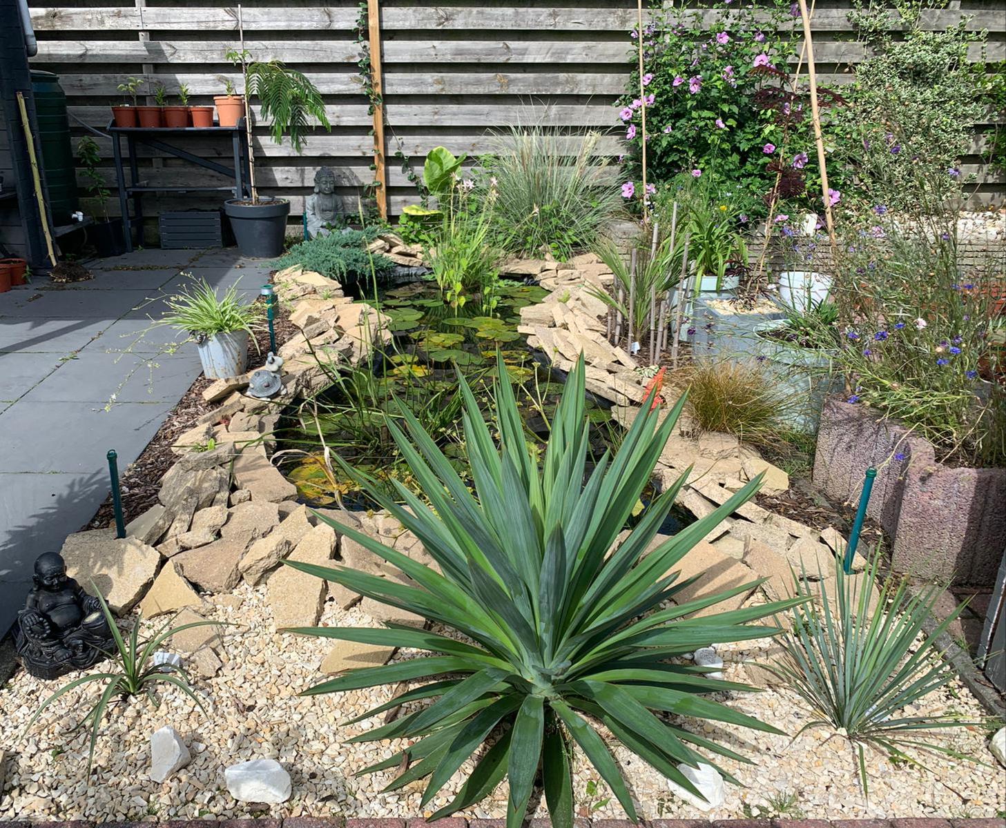 Dit jaar niet genoeg aandacht gespendeerd aan de vijver. Volgend jaar moeten hier ook een paar dingen anders. Even proberen wat niet opvallende oeverbakken te maken met Japans Holriet en Moeras Hibiscus. Moet zeggen dat het ook een beetje laveloos lijkt doordat de lelies al op de retour zijn. Deze waren dit jaar wel echt spectaculair. De Yucca's zijn ook redelijk opgeschoten