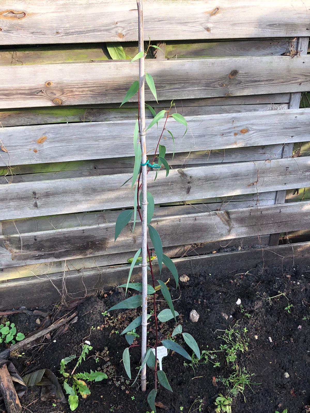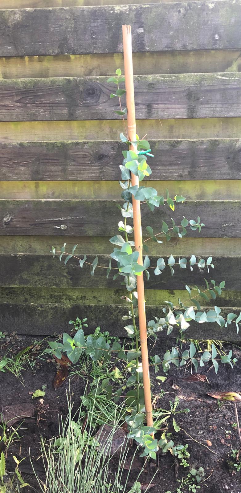De Eucalyptussen zitten erin maar zijn nog niet goed te zien. Naast de Ceris canadensis "lavender twist" staat nog een zaailing van Cercis canadensis die dus rechtop groeit. Het is een beetje de bedoeling dat vanuit deze optiek er een symmetrie asymmetrie is