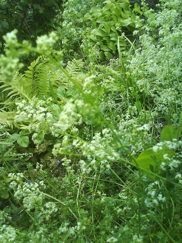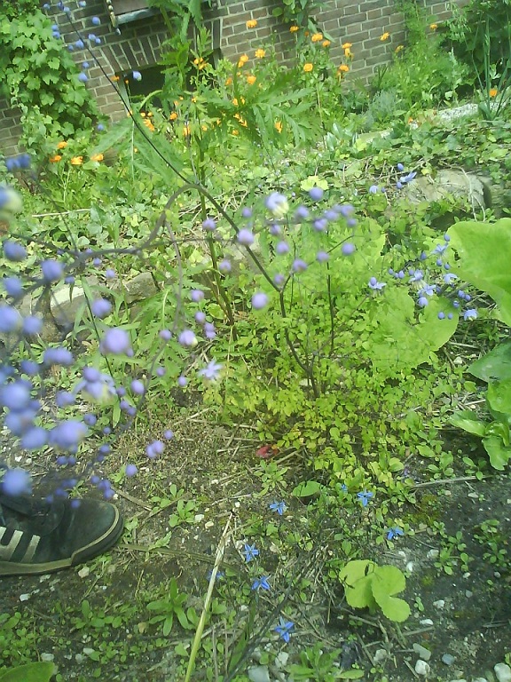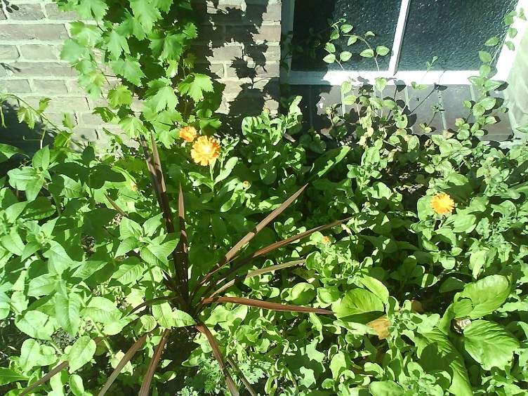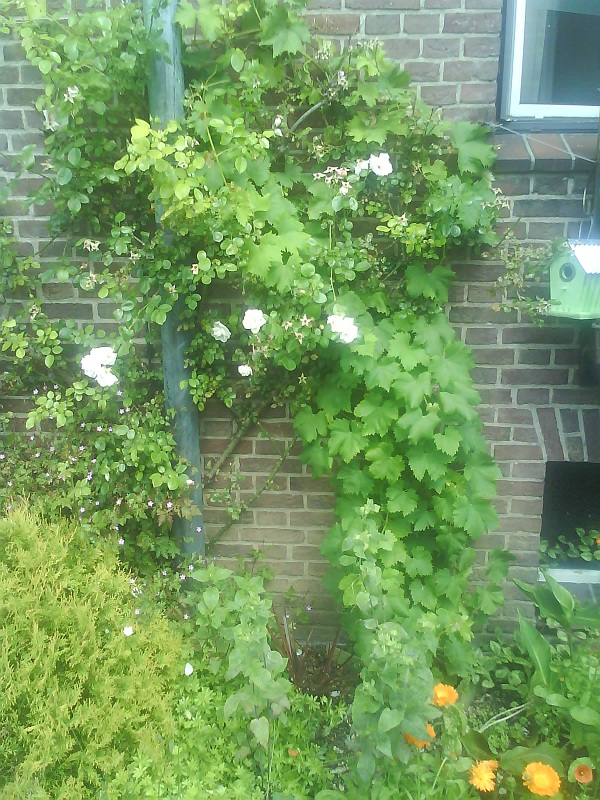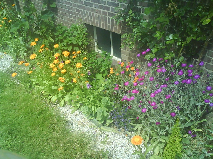 Weelderige groei tegen de zuidmuur. De goudsbloemen (die spontaan zijn opgekomen) zijn pas begonnen met bloeien.