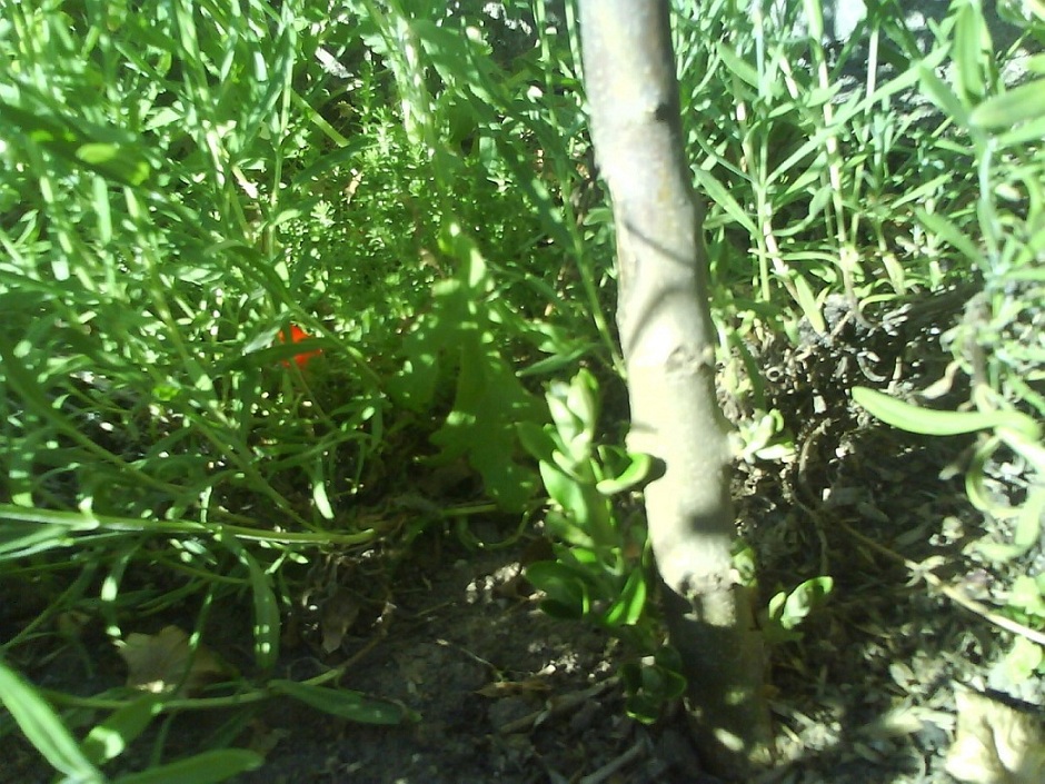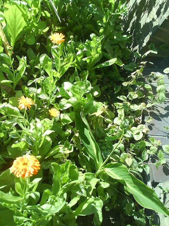 De goudsbloemen en omringende planten zorgen langzamerhand voor een aangename halfschaduw voor mijn kleine dicksonia.