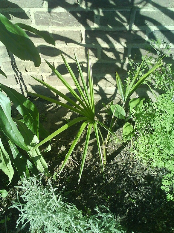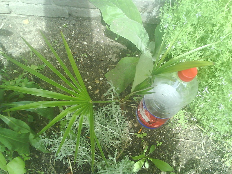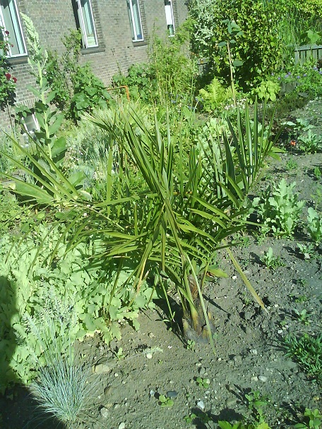 Nadat het tweede volwassen blad aan de Trachycarpus sp. nova heb ik het jeugdblad verwijderd. Nu de hoogte in!