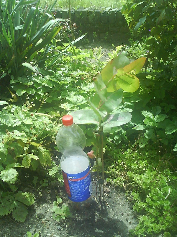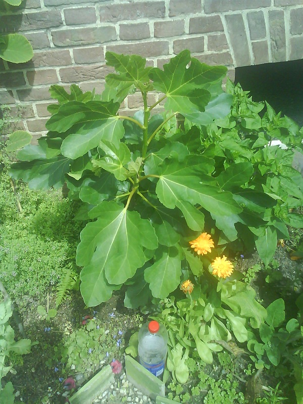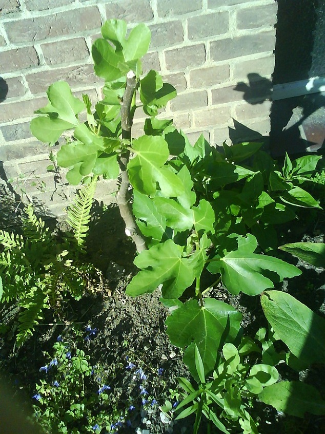 De ficus carica (vijg) is afgelopen maand van een paar spruitjesvormige knoppen overgegaan in weelderige groei. Uitschieters aan de voet van de stam verwijderd, maar heb de sterkste laten zitten om een tweede stammetje te vormen.