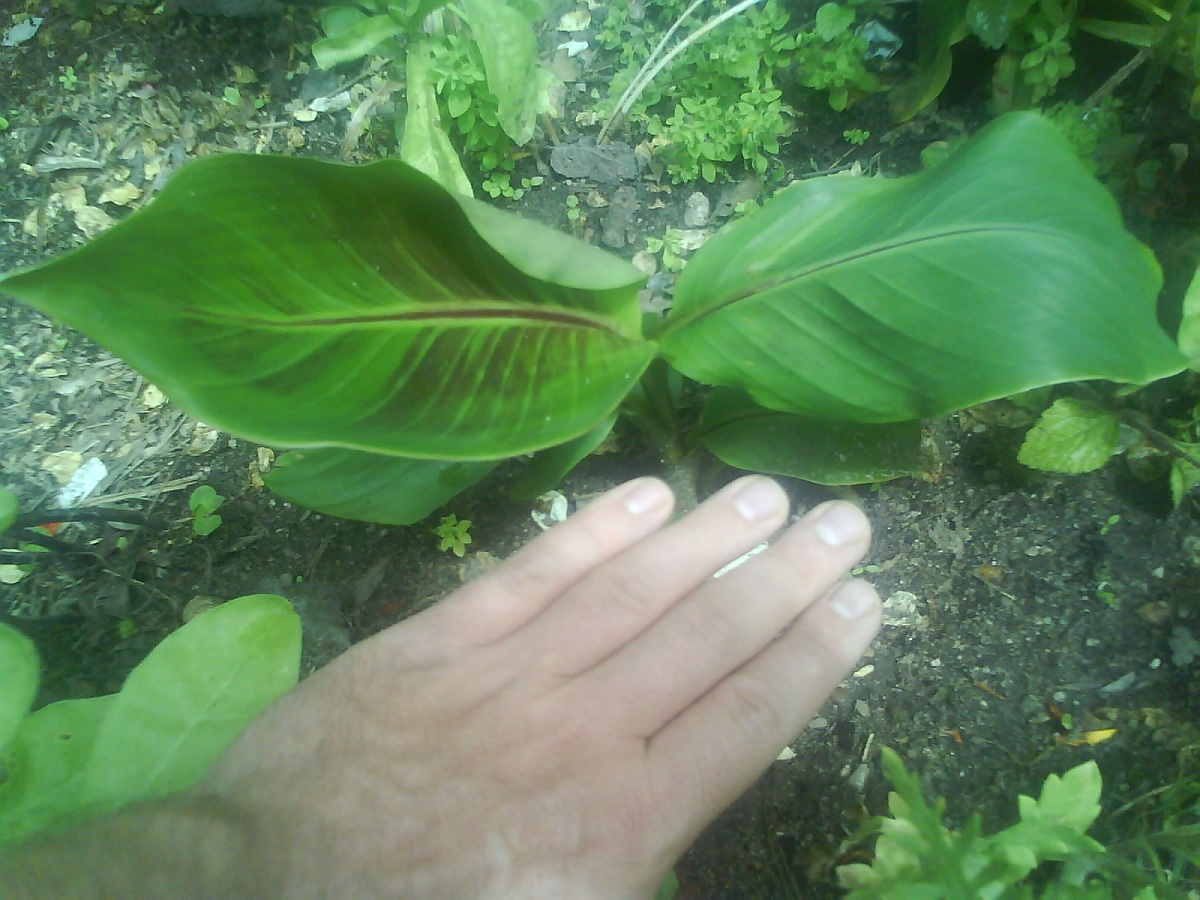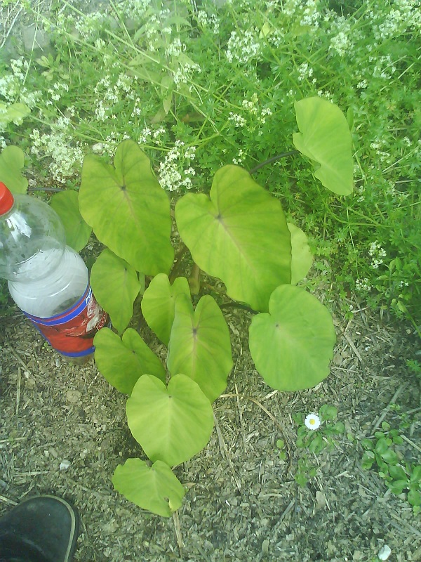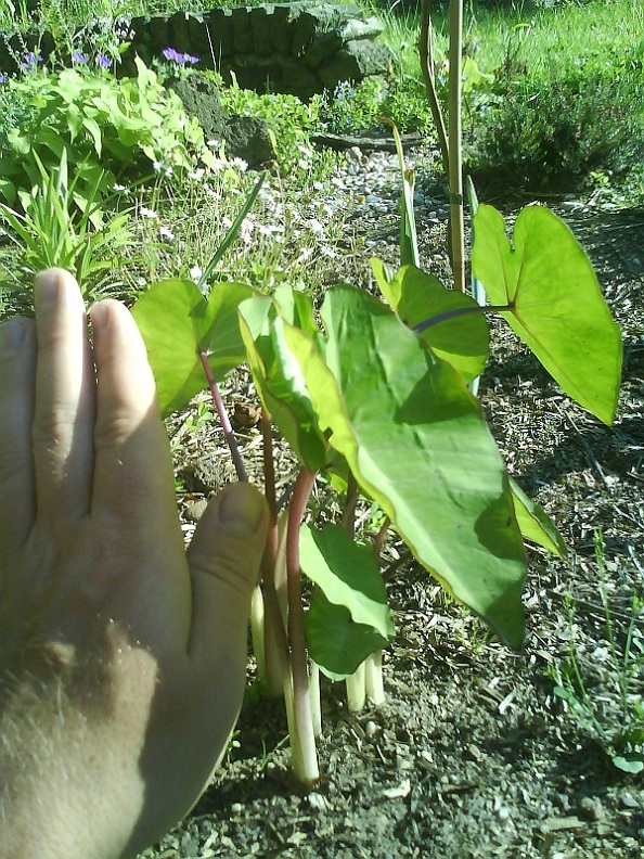 De colocasia 'Pink China' was uiteraard blij met de warmte in mei. Veel nieuwe bladeren, maar helaas nog niet het formaat van een echt olifantenoor.