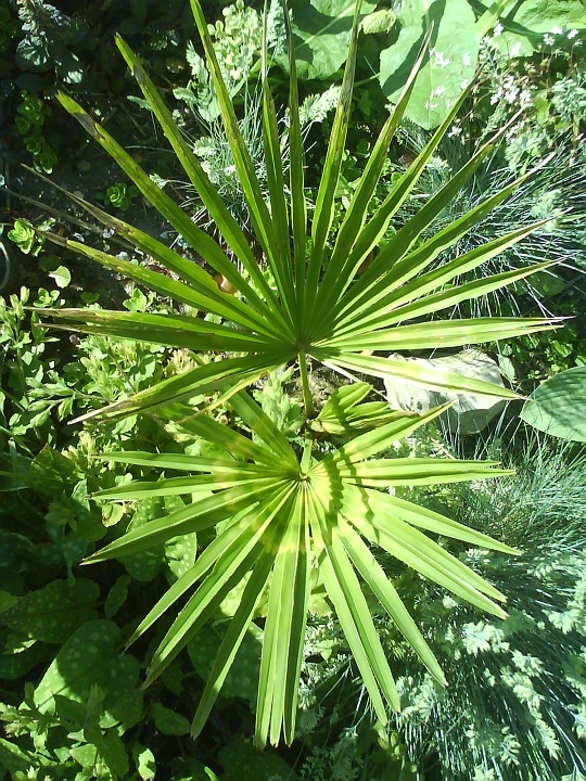 Bovenaanzicht trachycarpus fortunei. Halverwege mei al het oude halfdode blad verwijderd. Dit zijn alle nieuwe bladeren van na de winter tot nu toe. Op het onderste blad zie je duidelijk kringen (uitgegroeide speerrot?).