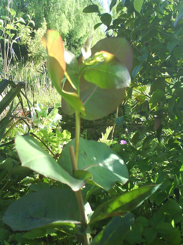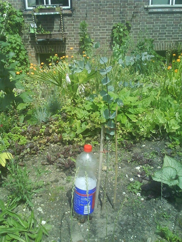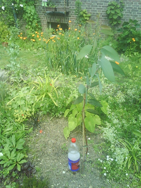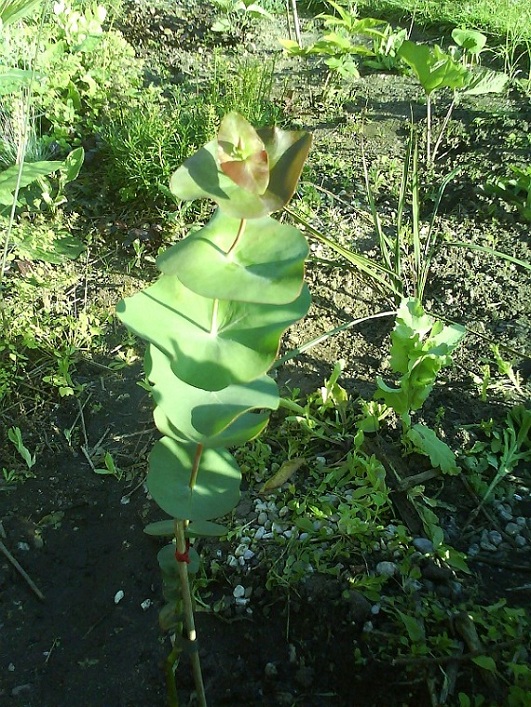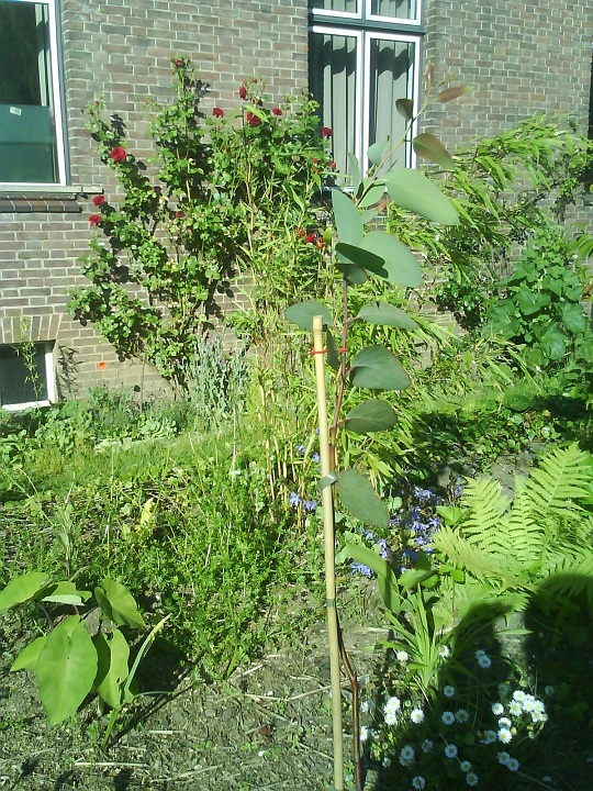 Alles boven de bamboestok zijn nieuwe scheuten van deze eucalyptus debeuzevillei. Alle nieuwe scheuten daaronder heb ik zorgvuldig weggeknipt om hoogtegroei te stimuleren.