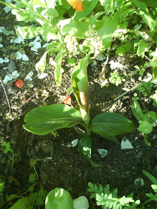 De canna's die nooit zijn uitgegraven wurmen zich omhoog tussen de goudsbloemen.