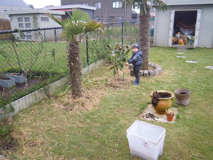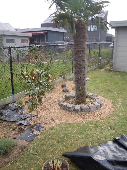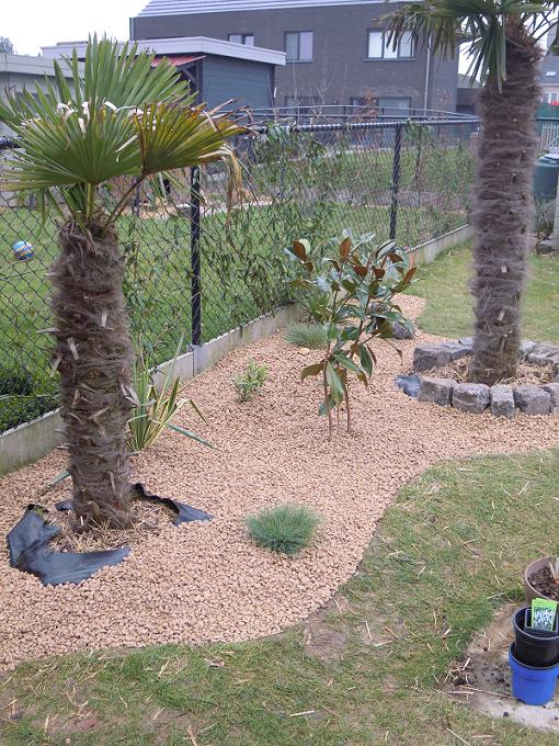Ik ging er van uit dat er een boordje was, maar goed, dit komt nu in orde. Door de keitjes komt de tuin Meditterraan over, en dat was de bedoeling, dacht ik. Is dat een Phormium Tenax die je daar ook geplant hebt ? Die ga je moeten beschermen, als het volgend jaar weer zo'n winter is zoals deze en het jaar ervoor zal ze er onder lijden als ze al niet ermee ophoudt.