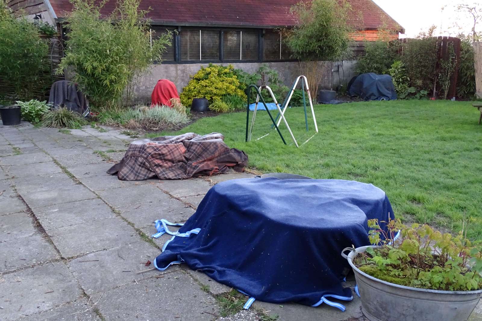 Maar na het forum uitje kwam er vorst............. en dan. Ik als een gek struinen op deze site hoe ik alles in leven kon houden. ( om het risico te beperken heb ik van alles wel direct 2 gekocht! ) Inpakken / afdekken kwam ik overal tegen. Maar als je 's avonds er achter komt dat het serieus gaat vriezen, moet je het doen met de materialen die je hebt.