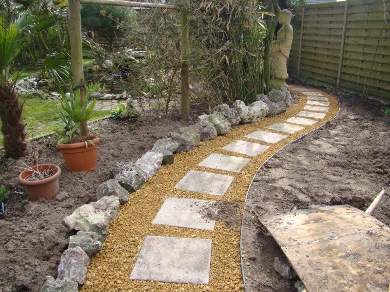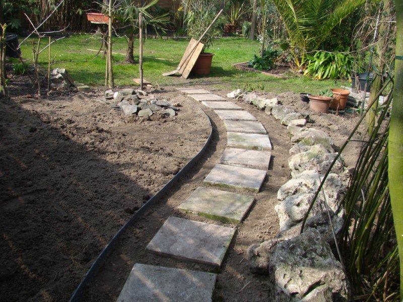 Hier enkele foto's van ons nieuw project : het tuinhuis op palen werd afgebroken, een wandelpaadje aangelegd, en op de vrijgekomen ruimte is oa. plaats voor een driestammige trachycarpus. Ook is er een plaats voorzien voor de maurelli.