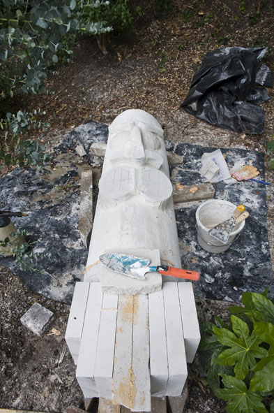 Ik heb gelukkig hulp van mijn vriend Gooijert want het is best een pittig karwei. Het beeld wordt uiteindelijk geen 1,70 maar 1,60 hoog. Hij is gisteren met de slijptol aan de gang gegaan en het is nu een half rond beeld, ik ben daarna gaan vijlen en gipsen, de mond, wenkbrouwen, en neus zijn gezaagt en gevijlt. Maar ja het moet op een ronde ondergrond komen, dus al die delen die erop worden gelijmt moeten aan de achterkant dus bol zijn!!! Ik vijl en rasp me rot!