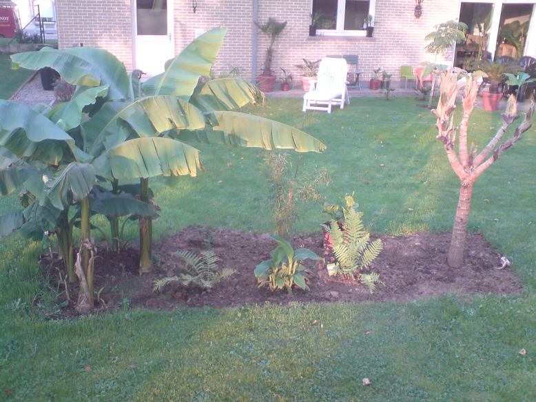 Die waggie helemaal op de achtergrond komt hier volgend jaar ook bij te staan. Daar waar nu de Washingtonia in pot staat.