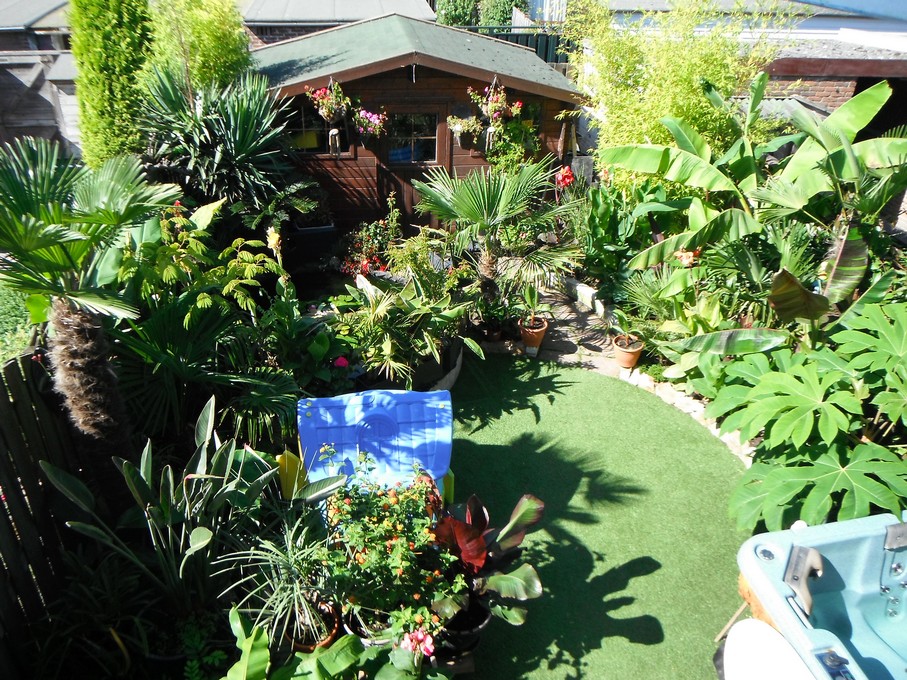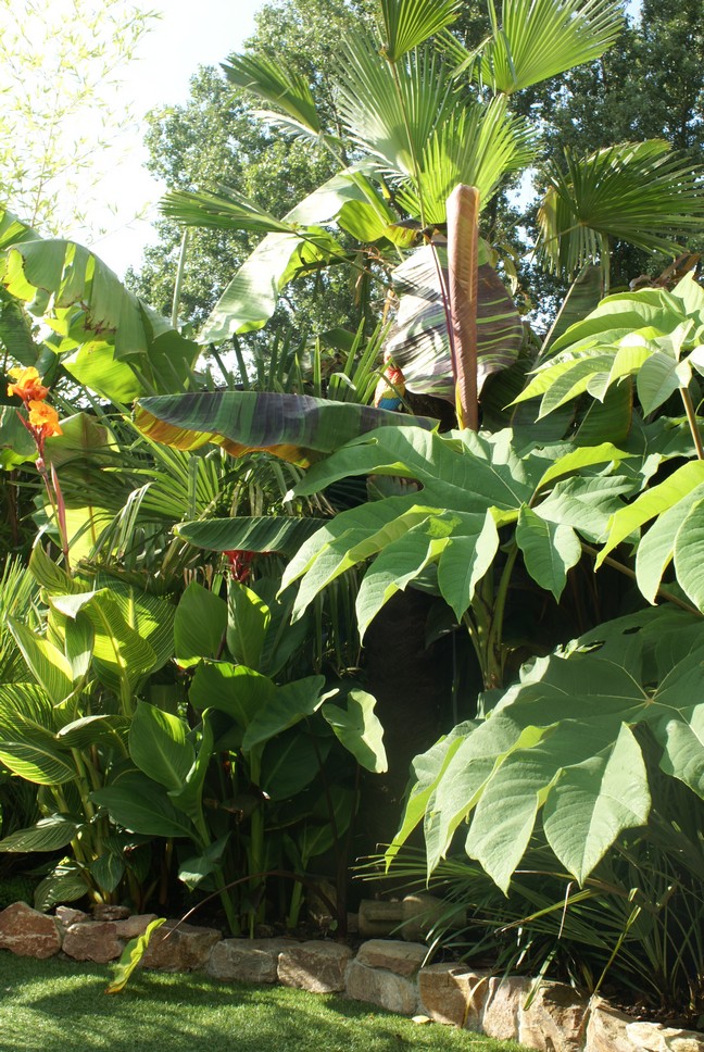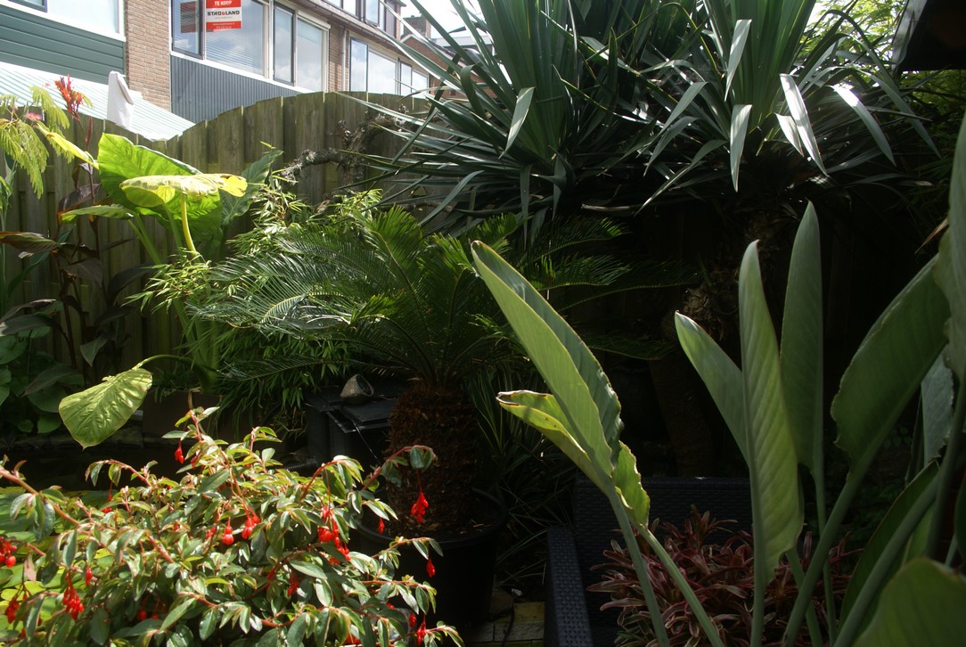 Het blijft een mooie tuin! De canna's ook super...bij mij doet de intrigue het zeer slecht dit jaar vrees dat deze ook het virus heeft, heb hem 3 jaar geleden bij CB meegenomen, ps jou colocasia is wel geen esculenta, die zijn helemaal groen. Deze heet een rode stam en denk eerder aan illustrus.