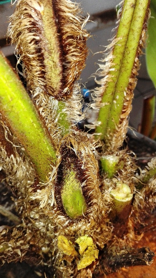 P.s ik zie dat er een aantal stelen kort zijn afgenomen /gebroken] bij het groeipunt ! Probeer dit te mijden, de stelen kunnen gaan bloeden en loopt dit sap in het groeipunt, beter is ze knakken langs de stam af en dan 2 weken wachten dan kun je de steel weghalen achter het knikpunt.
