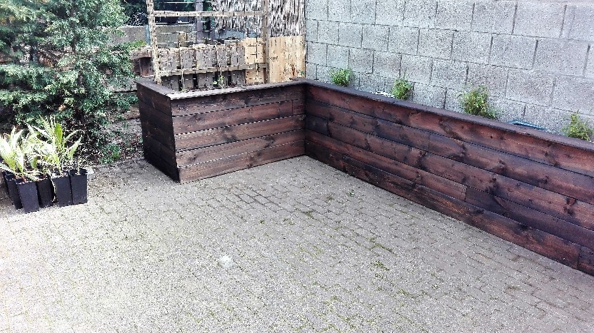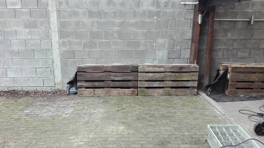 Hout is behandeld met de vervanger waar ze vroeger treinbils mee behandelen is een bio product van verkrijgbaar. Heet carboxyl geloof ik. Rob de planken komen van Formido al de rest is europallets.