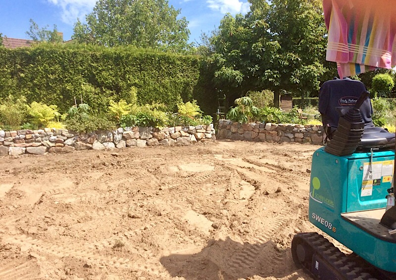 Dit wordt de ingang naar het witte zand. Er komt een ‘strandflonder’, zo’n looppaadje van planken die ook op het strand liggen. Op die manier valt het zand tussen de planken door van de voeten af. Zo blijft het zand tussen de muren en niet op het omringende gras. De bedoeling is dat het paadje aan de ingang een ‘spannend paadje’ wordt. Denk aan bush bush, zodat het zand nog niet te zien is door overwoekerend van de planten aan de zijkanten.