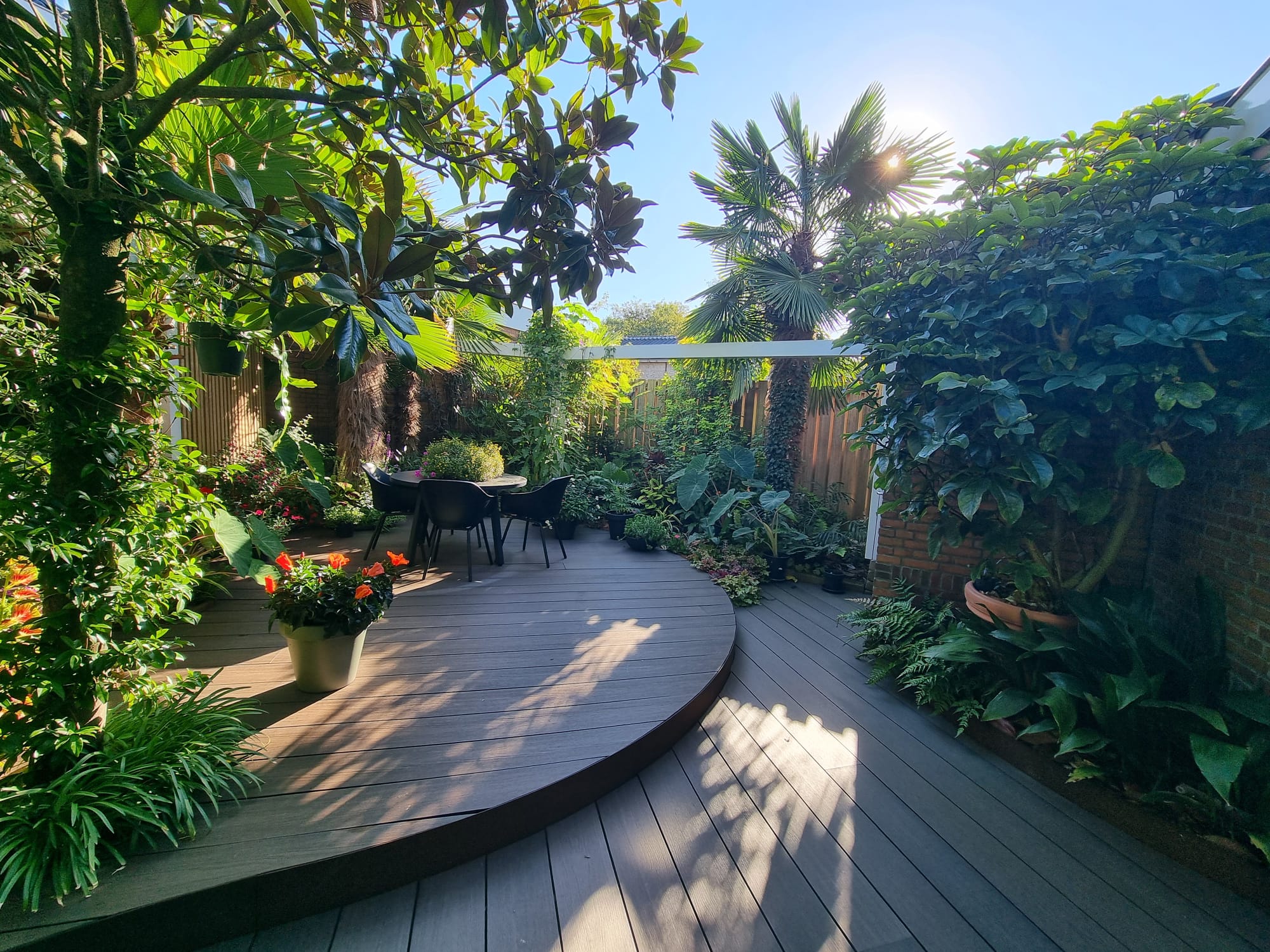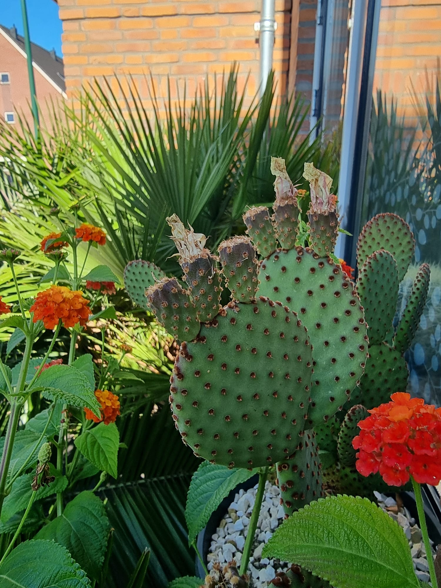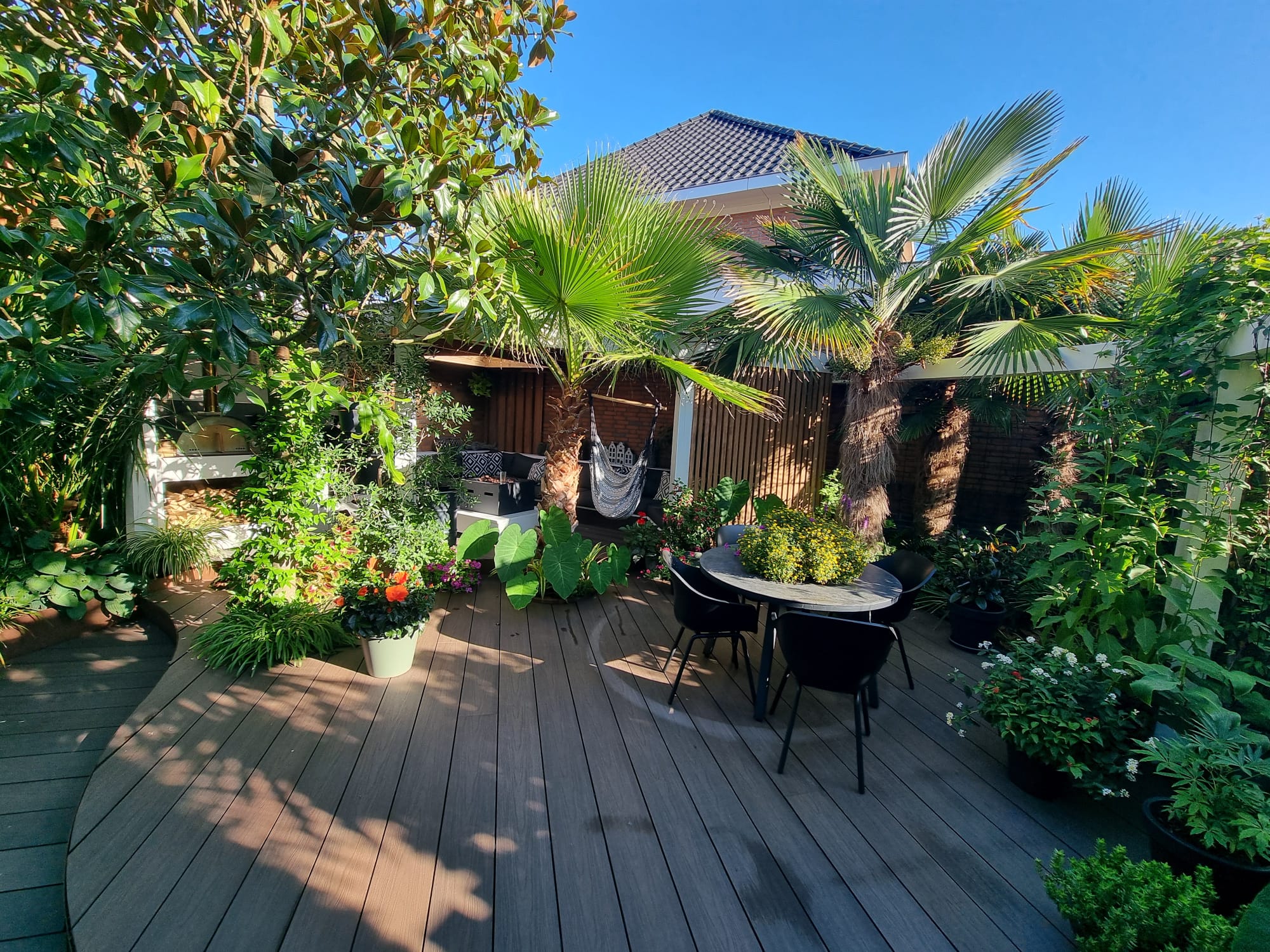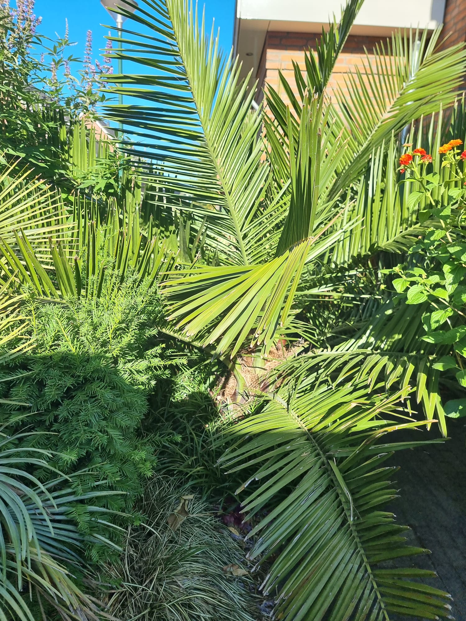 Inmiddels zijn we vijf jaar verder. Als ik dit topic zo doorlees dan is er veel veranderd. De tuin heeft drie jaar geleden een complete make-over gekregen, maar heel veel palmen staan nog op dezelfde plek als voorheen. Alleen zijn deze minimaal 1,5 m hoger geworden Trachycarpus fortunei, princeps, princeps New Form, ukrhulensis, wagnerianus) of 20-30 cm dikker (Phoenix, Jubaea) of drie keer voller (Chamaerops, Thritrinax, Rhapidophyllum). Het blijft een uitdaging zoveel soorten te herbergen in een relatief kleine tuin en het toch ruimtelijk te houden. Nu ik bij de trachcarpussen onder de kroon door kan lopen met mijn 2 m, schept dat geleidelijk ruimte voor andere soorten. Groot voordeel is dat bescherming ook redelijk goed te regelen is als alles zo dicht bij elkaar staat. Ik ben er ook best trots op dat ik in al die jaren eigenlijk geen verliezen heb. Alles komt in de regel netjes uit de bescherming en dat zie je ook terug in de groei. Veel van wat je ziet op de foto's staat in de vollegrond, op een aantal bloeiende planten in kuipen na. Het zijn dan wel geen septemberplaatjes, maar augustus is al een heel eind voorbij en nu heb ik even tijd.