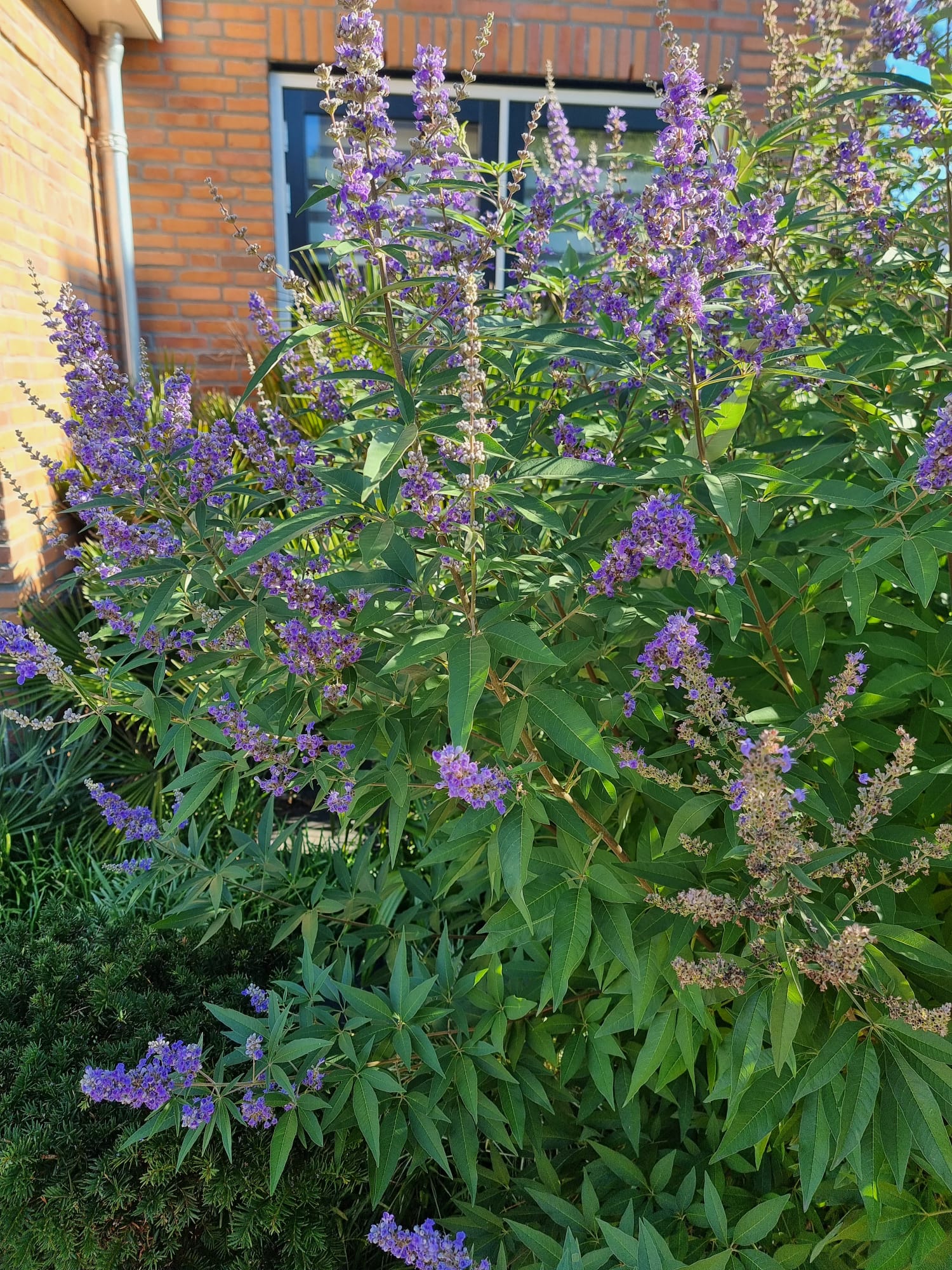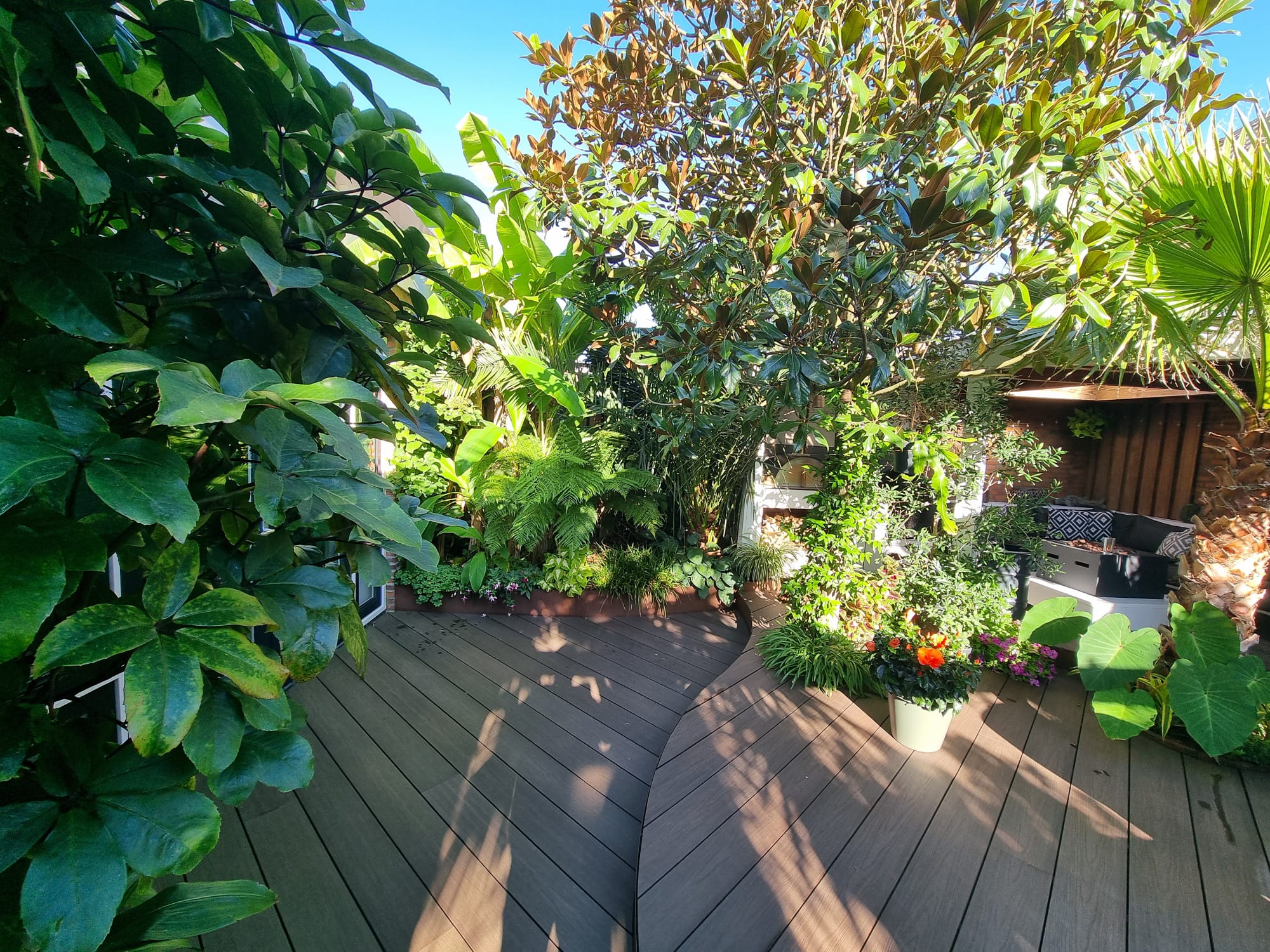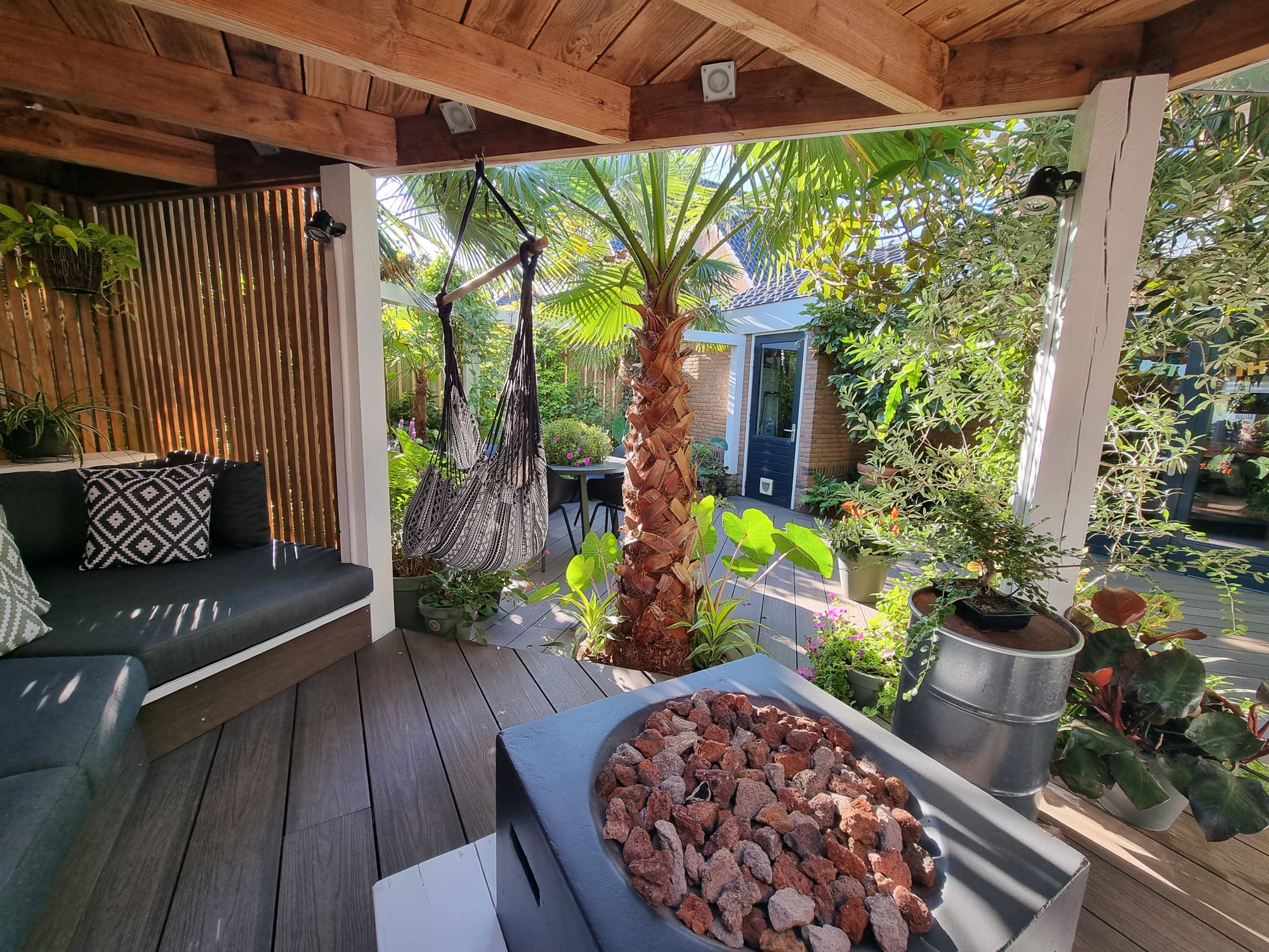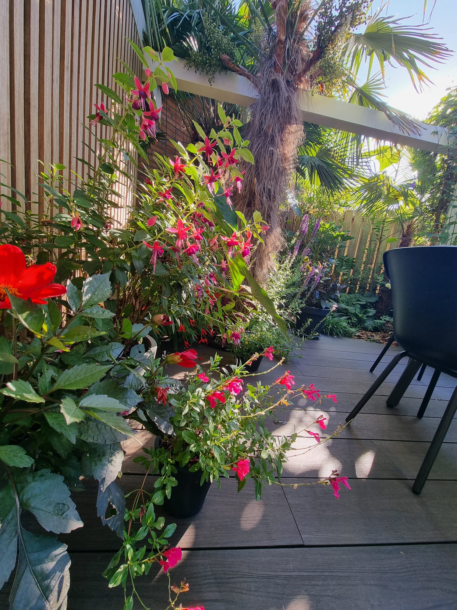 Inmiddels zijn we vijf jaar verder. Als ik dit topic zo doorlees dan is er veel veranderd. De tuin heeft drie jaar geleden een complete make-over gekregen, maar heel veel palmen staan nog op dezelfde plek als voorheen. Alleen zijn deze minimaal 1,5 m hoger geworden Trachycarpus fortunei, princeps, princeps New Form, ukrhulensis, wagnerianus) of 20-30 cm dikker (Phoenix, Jubaea) of drie keer voller (Chamaerops, Thritrinax, Rhapidophyllum). Het blijft een uitdaging zoveel soorten te herbergen in een relatief kleine tuin en het toch ruimtelijk te houden. Nu ik bij de trachcarpussen onder de kroon door kan lopen met mijn 2 m, schept dat geleidelijk ruimte voor andere soorten. Groot voordeel is dat bescherming ook redelijk goed te regelen is als alles zo dicht bij elkaar staat. Ik ben er ook best trots op dat ik in al die jaren eigenlijk geen verliezen heb. Alles komt in de regel netjes uit de bescherming en dat zie je ook terug in de groei. Veel van wat je ziet op de foto's staat in de vollegrond, op een aantal bloeiende planten in kuipen na. Het zijn dan wel geen septemberplaatjes, maar augustus is al een heel eind voorbij en nu heb ik even tijd.