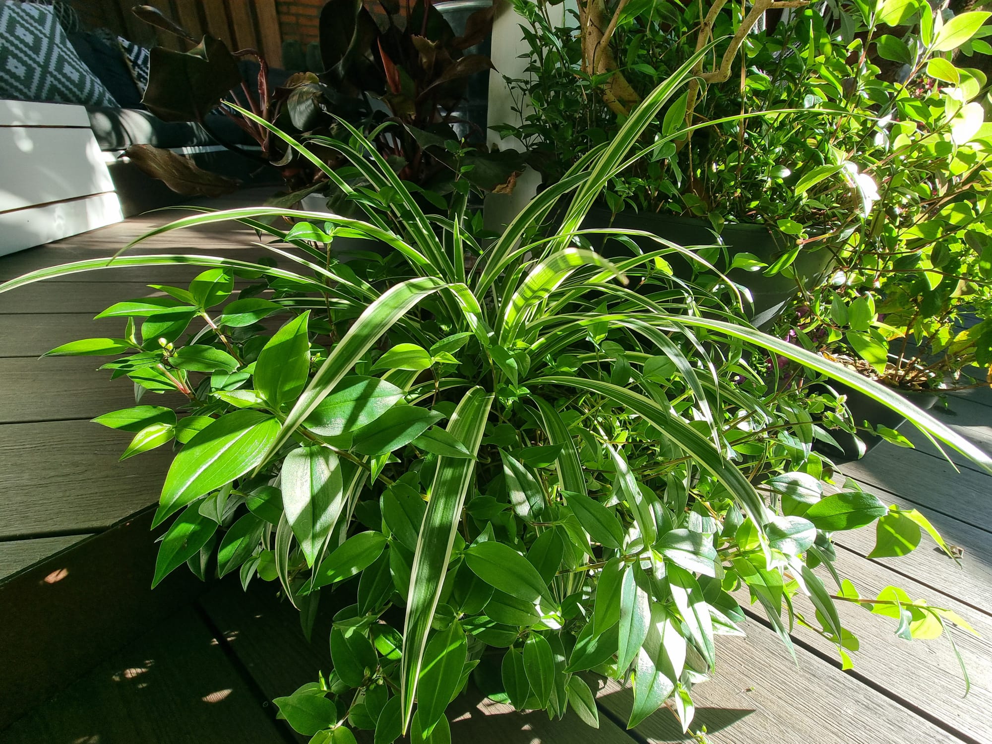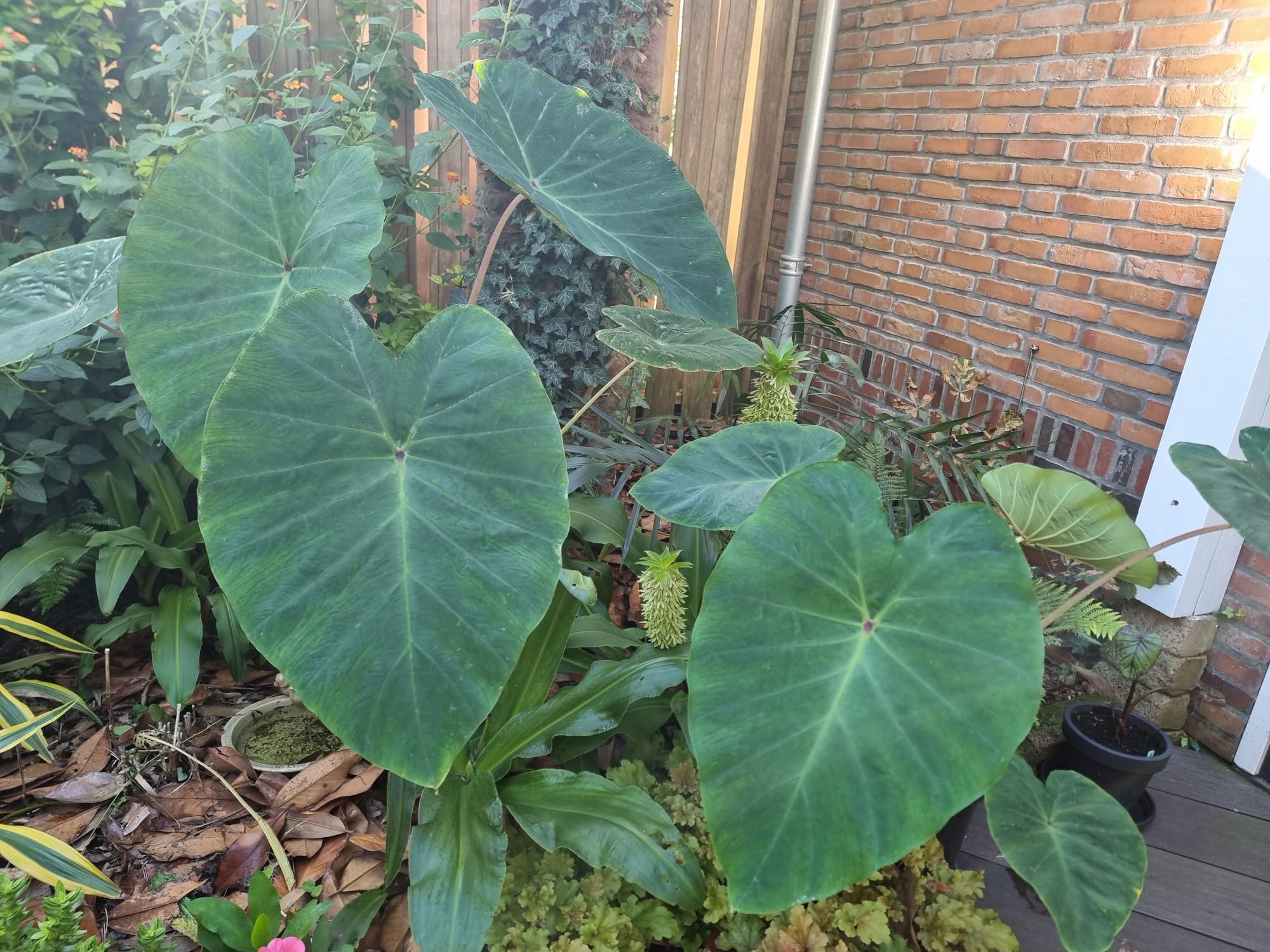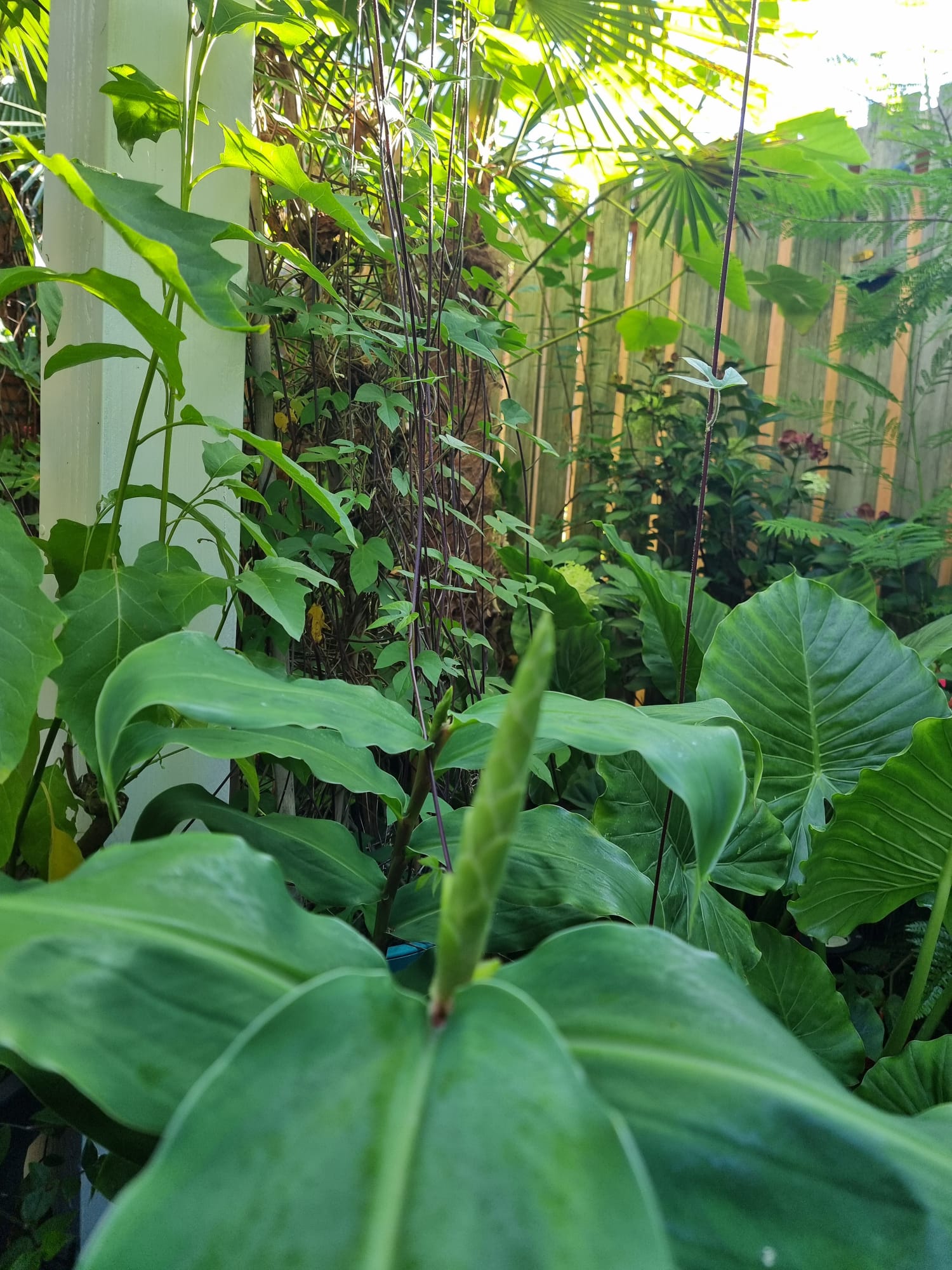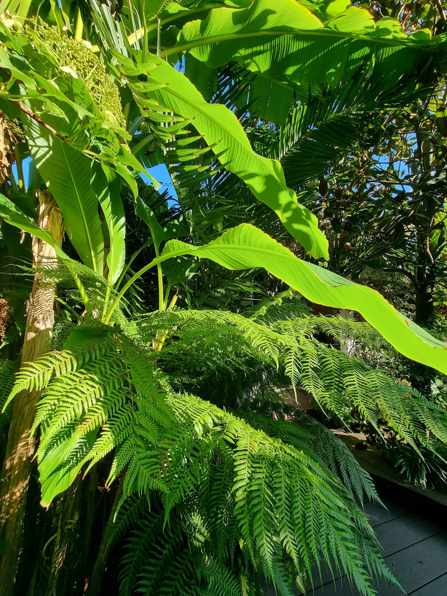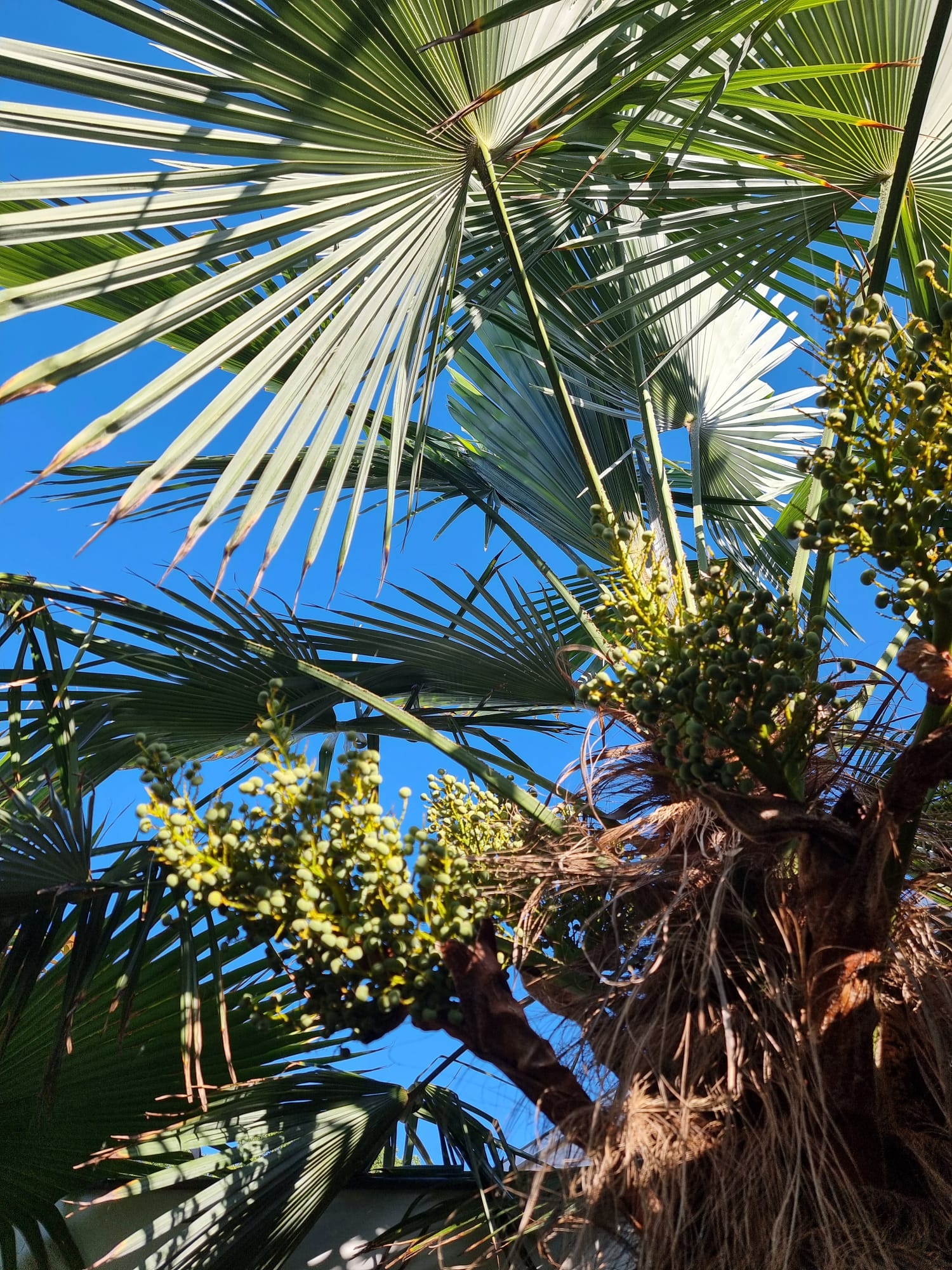 Inmiddels zijn we vijf jaar verder. Als ik dit topic zo doorlees dan is er veel veranderd. De tuin heeft drie jaar geleden een complete make-over gekregen, maar heel veel palmen staan nog op dezelfde plek als voorheen. Alleen zijn deze minimaal 1,5 m hoger geworden Trachycarpus fortunei, princeps, princeps New Form, ukrhulensis, wagnerianus) of 20-30 cm dikker (Phoenix, Jubaea) of drie keer voller (Chamaerops, Thritrinax, Rhapidophyllum). Het blijft een uitdaging zoveel soorten te herbergen in een relatief kleine tuin en het toch ruimtelijk te houden. Nu ik bij de trachcarpussen onder de kroon door kan lopen met mijn 2 m, schept dat geleidelijk ruimte voor andere soorten. Groot voordeel is dat bescherming ook redelijk goed te regelen is als alles zo dicht bij elkaar staat. Ik ben er ook best trots op dat ik in al die jaren eigenlijk geen verliezen heb. Alles komt in de regel netjes uit de bescherming en dat zie je ook terug in de groei. Veel van wat je ziet op de foto's staat in de vollegrond, op een aantal bloeiende planten in kuipen na. Het zijn dan wel geen septemberplaatjes, maar augustus is al een heel eind voorbij en nu heb ik even tijd.