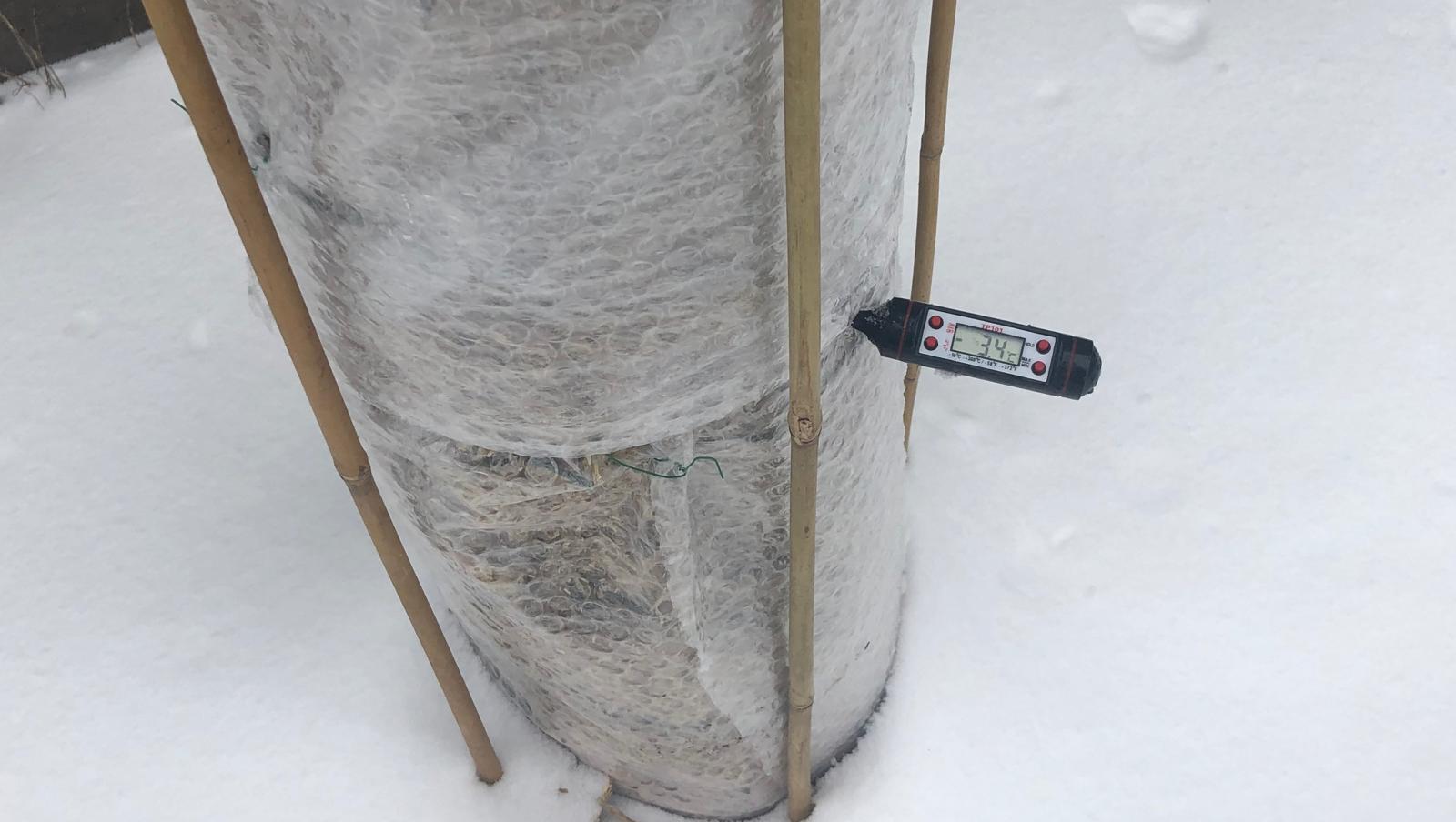 En dit is het dan de grote test! Doem-scenario voor de Eucalyptussen in hun eerste jaar, hoewel ze deze temperaturen beschut aan zouden moeten kunnen als volwassen boom denk ik niet dat ze dit overleven in hun eerste jaar. Wel heb ik een aantal Debeuzevillei zaailingen buiten laten staan, de zachte nieuwste groei was eraf gevroren maar het leerachtige blad ziet er nog wel goed uit, wie weet zijn ze sterker dan we denken...we zullen het zien. In de eerste instantie dacht ik dat mijn bescherming ideaal is voor een week, maar nu is de voorspelling dat het misschien wel tot 22 februari aanhoudt. Het nadeel van deze kokers met noppenfolie is dat het geheel niet ademt. Er zit wel stro bij in, dat kan broei veroorzaken waardoor rot ontstaat maar zolang het vriest lijkt me dit geen probleem. Als overdag de temp weer boven de 6 komt haal ik het eraf. De parvula ga ik nog inwikkelen met een ouderwetse lichtslang, van parvula heb ik namelijk geen verzekeringsplant.
