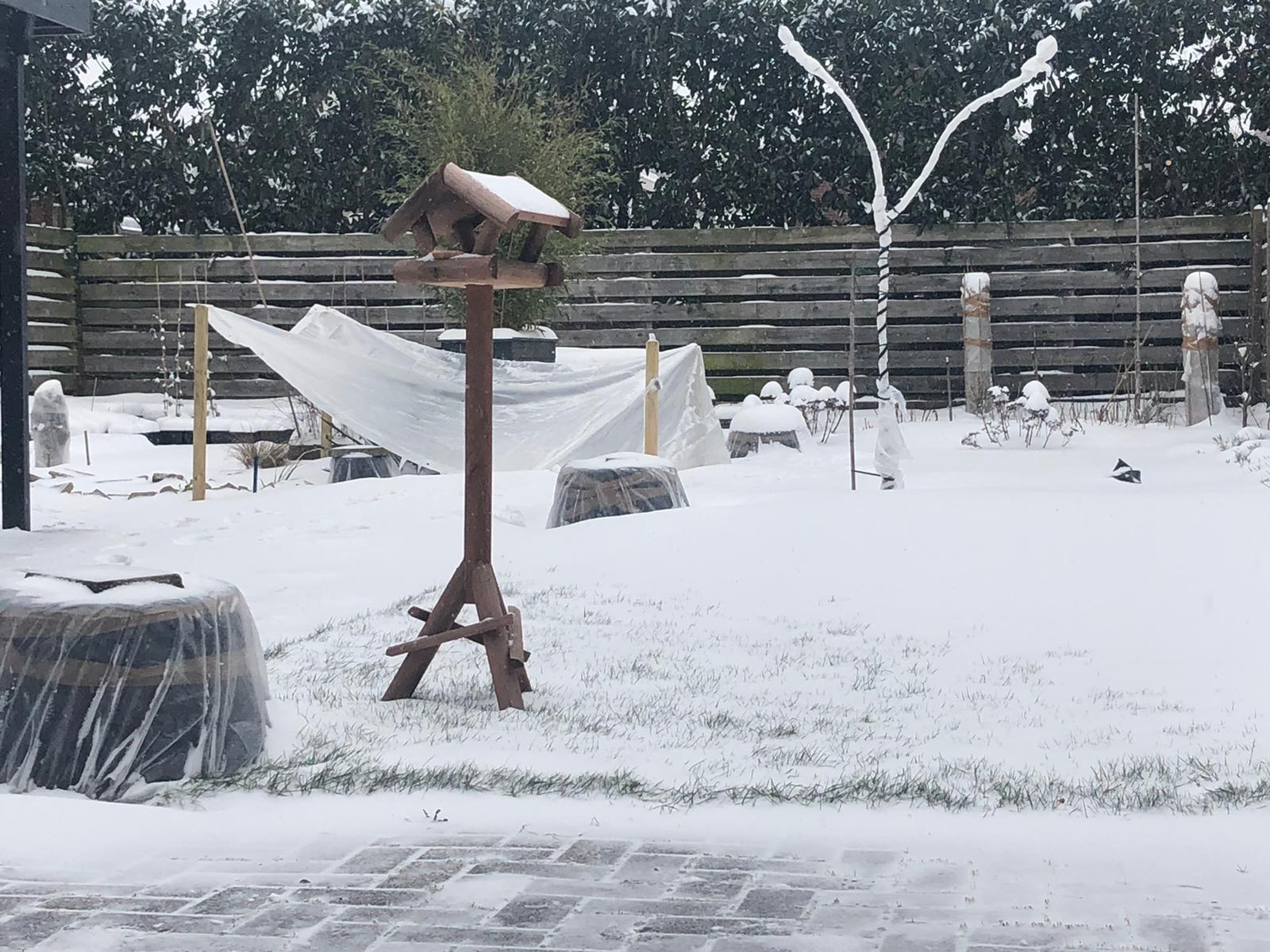 De Trachycarpussen pasten nog net onder specikuipen. Ook dit geheel was eigenlijk voor een week bedoeld en het ademt niet echt, laat staan met de sneeuw. Alleen door de harde wind (zonder neerslag toen nog) waren de palmen compleet droog, dit zal helpen.