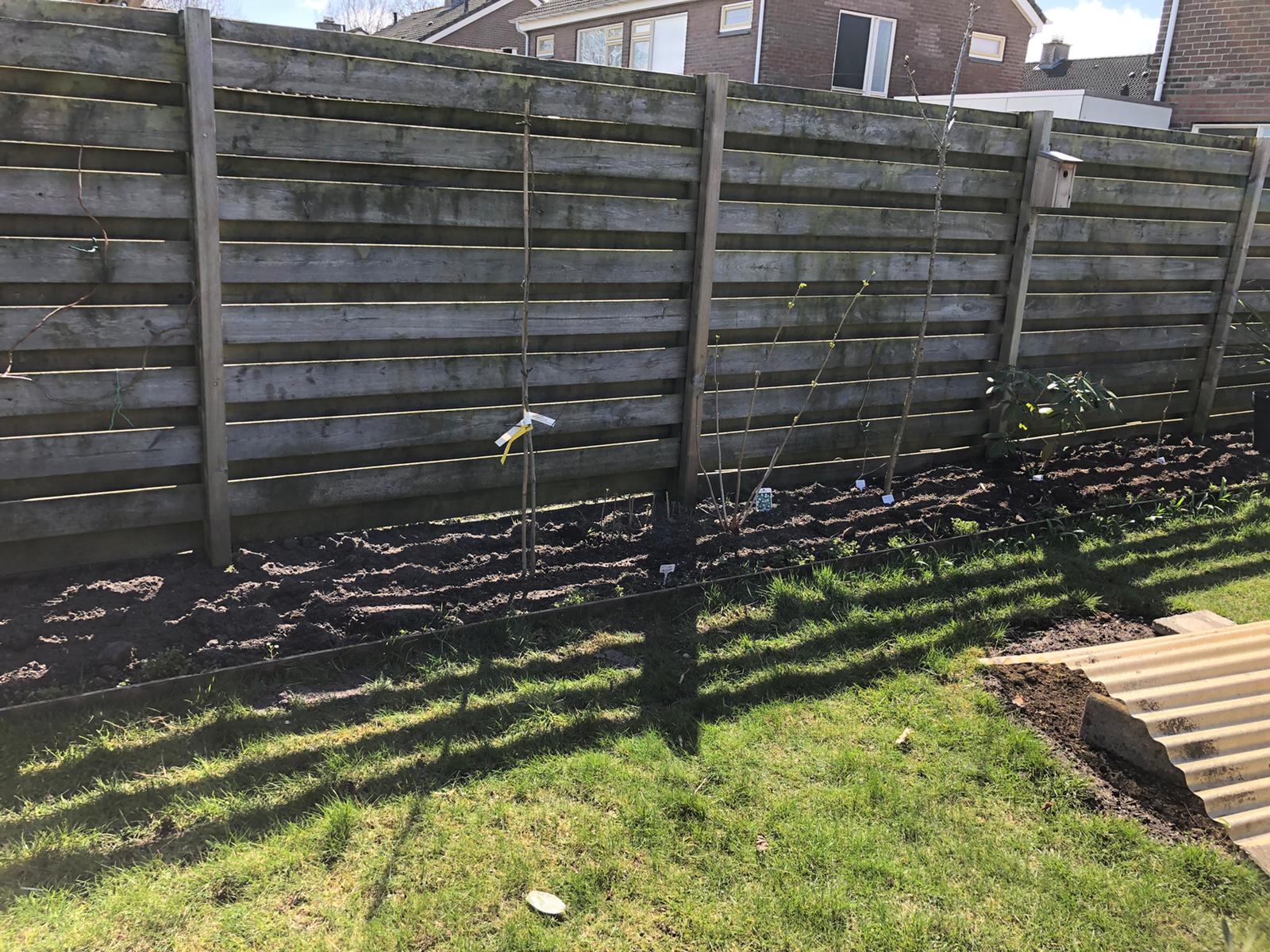 Bij de Wisteria's ga ik palen van de schutting tot een paal voor aan de bak maken. Zodat ik deze om de paal kan binden. Leuk idee vind ik zelf want dan kan de bloei hangen. Maar dit is ook een beetje een geval van is het de moeite nog waard. Het kan namelijk jaren duren voordat wisteria bloeit (groeien doet ie snel genoeg dus de paal is dan iig snel genoeg vol met blad). De Hibiscus in het midden vind ik ook maar een triest geval. Deze is door de vorige bewoners nooit gesnoeid maar wel als boomvorm gekocht, dus heb maar opnieuw geprobeerd het in model te brengen maar geen daverend succes vind ik zelf. De snoeiwonden door de verwaarloosde takken zijn ook aardig groot. Tevens hebben ze hem ook een beetje scheef ingepoot. Verwijderen vond ik ook zonde en dit was ook weer eens een gevalletje is het de moeite nog waard. Rechts van de rechter Wisteria wil ik Indigofera amblyantha proberen.