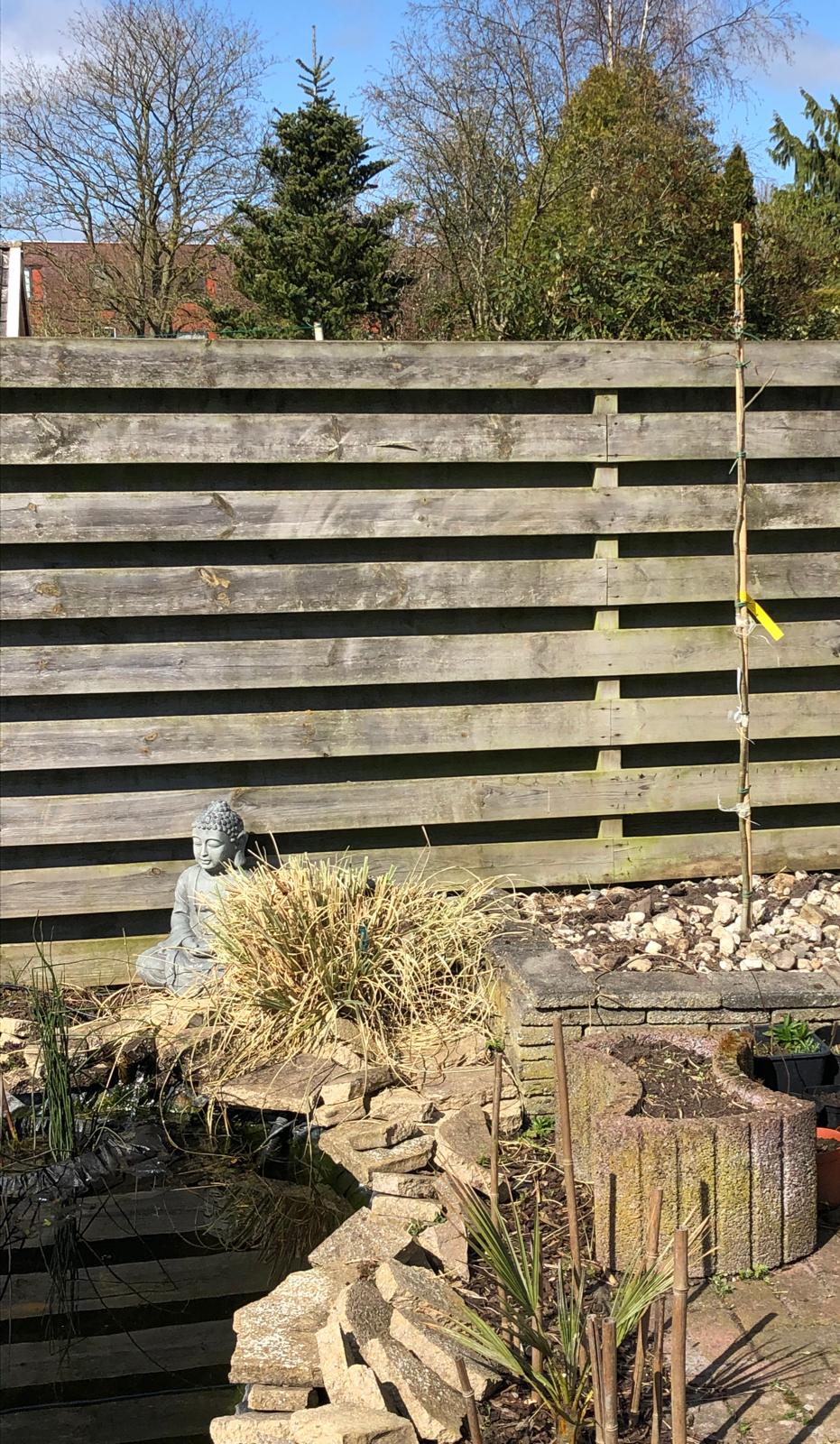 De Hibiscus struik heb ik verwijderd, deze was erg vervelend als ik bij de vijverpomp achter het pampasgras moest zijn. Dus hier staat nu de nieuwe Albizia 'Ombrella'. De bak is overigens niet dicht aan de onderkant, het is gewoon een verhoging (idee van de vorige bewoners). Waarschijnlijk woon ik hier geen jaren meer dus het wordt steeds meer passen en meten wat nog de moeite waard is. Erg lastig :onzeker: ! Hopelijk drukken oppervlakkige wortels van de Albizia niet teveel tegen de tegels.. Rechts hiervan ga ik een aantal Tecoma Stans inplanten. Niet super winterhard maar zou vanuit de wortels weer kunnen komen. Misschien heb ik een geluk en zit er een sterk individu tussen....Experimentje! De Chamaerops is trouwens met enige bladschade wel door de winter gekomen zoals het nu lijkt! Nu had deze ook een iglo van mij gekregen maar dat is ook geen overbodige luxe bij deze soort natuurlijk..