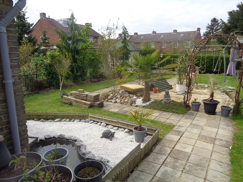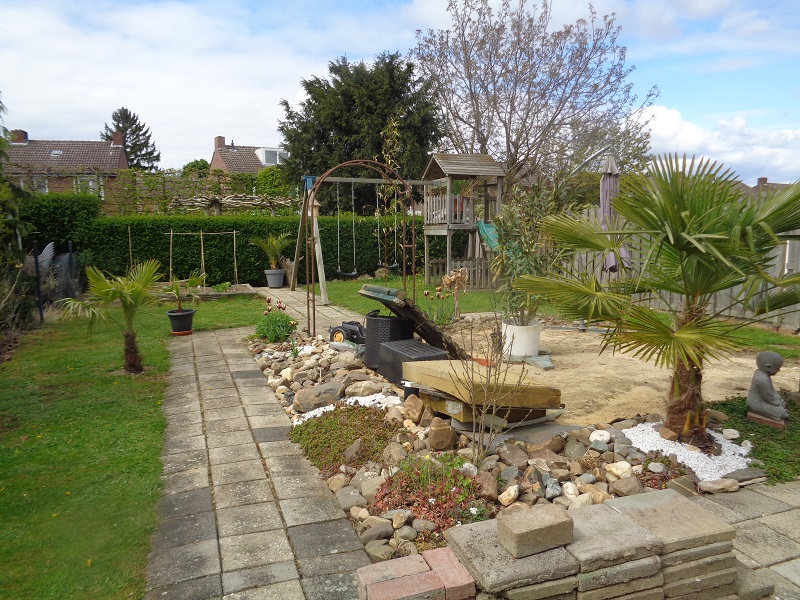 Uiteindelijk is het de bedoeling achter in de tuin nog een vijver te maken welke half in de grond half boven de grond komt te liggen en deze 2 vijvers wil ik verbinden met een grote beekloop. Zo kunnen we uiteindelijk toch weer vissen houden en schildpadden haha :thumb_up: