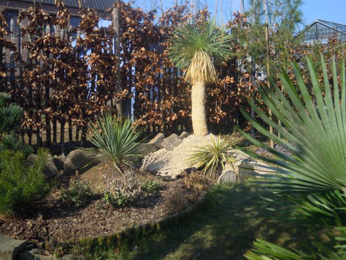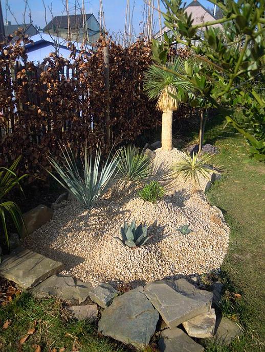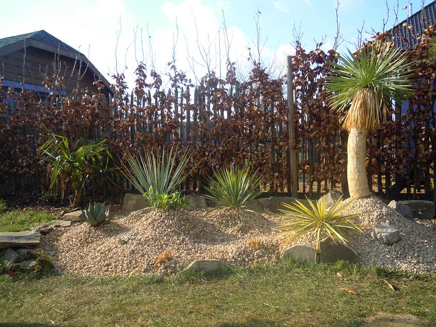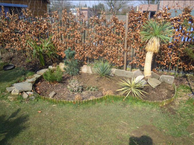 Ik heb een heleboel oledanders staan voor April maar ook twee Yucca rostratas waarvan één van 1 meter, een agave havardiana, een trachy princeps en een satsuma mandarijnboompje in bestelling. Dit wordt ook met grint afgewerkt aan de zuidkant.