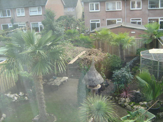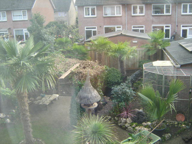 Je tuin is adembenemend en je plantencollectie is om bij weg te dromen. Je hebt echt prachtige planten staan. Je russische rabarber steekt zo mooi af tegen de rest op zijn plaatsje in je tuin. Ik heb deze al enkele keren geprobeerd. 3 soorten zelfs maar heb er altijd pech mee. Meestal in het 2de jaar na aanplant zijn ze echt de max, groot en in bloei, en daarna krijg ik met veel geluk het jaar erop een miserabel klein plantje dat terug opkomt en het na een paar weken gewoon opgeeft. Erg jammer want ik vind deze planten geweldig mooi. Zeker de roodbladige zoals de jouwe. Weet niet wat er fout loopt bij mij. Je Tetrapanax heeft me duidelijk gemaakt dat ik de verkeerde soort moet hebben want mijn exemplaren die hier nu toch al 7 jaar in de volle grond staan haalden nooit de hoogte of het bladformaat dat die van jou vertoond. Je Alocasia is betoverend met die stam. Heb er ooit eentje van iemand overgenomen met 1.6 m stam totale hoogte 2.7 m net voor de winter maar heb er nooit plezier aan gehad omdat de verwarming in de serre waar die gestald stond jammer genoeg een nacht was uitgevallen en hij urenlang een -5°C over zich heen had gekregen. Hier is hij niet van hersteld. Je Dasylirium in je voortuin is voor mij een utopische verre droom. Op zo'n plant zit ik al te smachten van dag 1 dat ik met exoten begonnen ben maar ik ken de prijzen en weet dat dat voor mij niet is weggelegd. Soms moet je gewoon realistisch zijn. Ook jou Sabal minor in kuip vind ik een prachtexemplaar. Heb er in de tuin enkele staan maar voor die zulk formaat bereiken ben ik waarschijnlijk al lang op pensioen. Geniet er van en laat ons ook meegenieten door foto's te blijven posten!