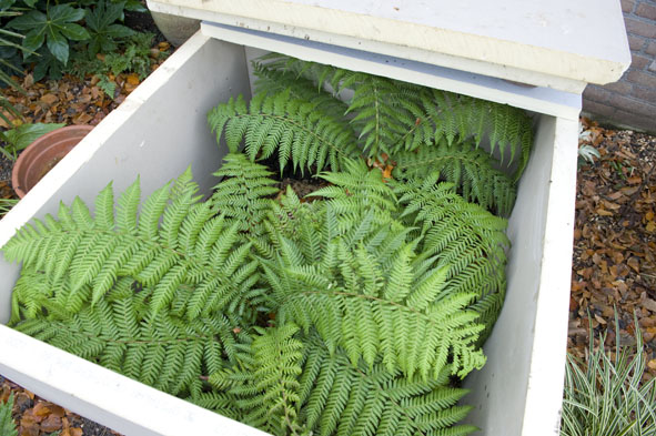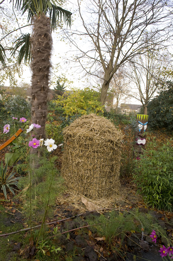 Van het weekend serieus bezig geweest met winterbescherming. 2 dicksonia antartica's zijn zo goed als ingepakt, het deksel van de isolatieplaten zit er nog niet op, want het is heerlijk weer voor de varens! De musa basjoo is nu wel helemaal ingepakt. Ons bananenbos is eerst in jute gewikkeld, daarna heeft hij een frame van gaas gekregen, daaromheen weer een laag jute, daar weer omheen een flinke laag stro, de binnenkant van het bananenbos blijft dus vrij. Als laatste laat is wederom jute gewikkeld en de bovenkant is voorzien van een laag plastic tegen de regen en sneeuw. Mocht het heel koud worden, dan kan bij de boomvarens een klein kacheltje bijgezet worden of lichtslang, dat zien we wel weer als het kouder wordt...Bij de musa kan ook altijd nog een lichtslang aangebracht worden.