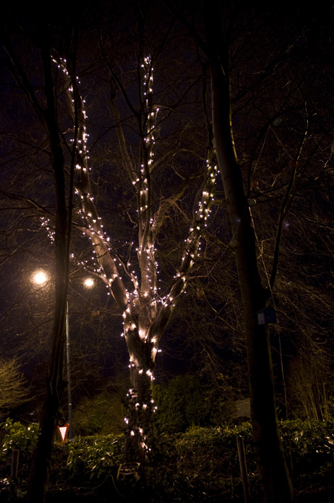 Jaja het is allemaal gelukt, uiteindelijk zondag nog een snoer van 10 meter erbij gehaald zodat de beukenboom nu mooi is verlicht. Er zit nu dan ook 50 meter :shock: lichtsnoer in!
