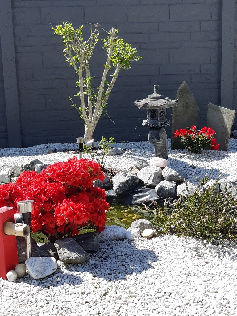 het valt op zich wel mooi van de weerkaatsing, het is een gebroken cararra steen (marmer) en dus de verkleuring is minimaal tot niet eigenlijk. De varens staan nu het 2de jaar en doen het op zich goed, bedoeling is wel dat er nog een paar m2 met Noors mos bedekt wordt zoals in het midden ook al te zien is.