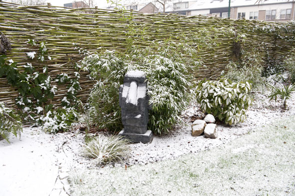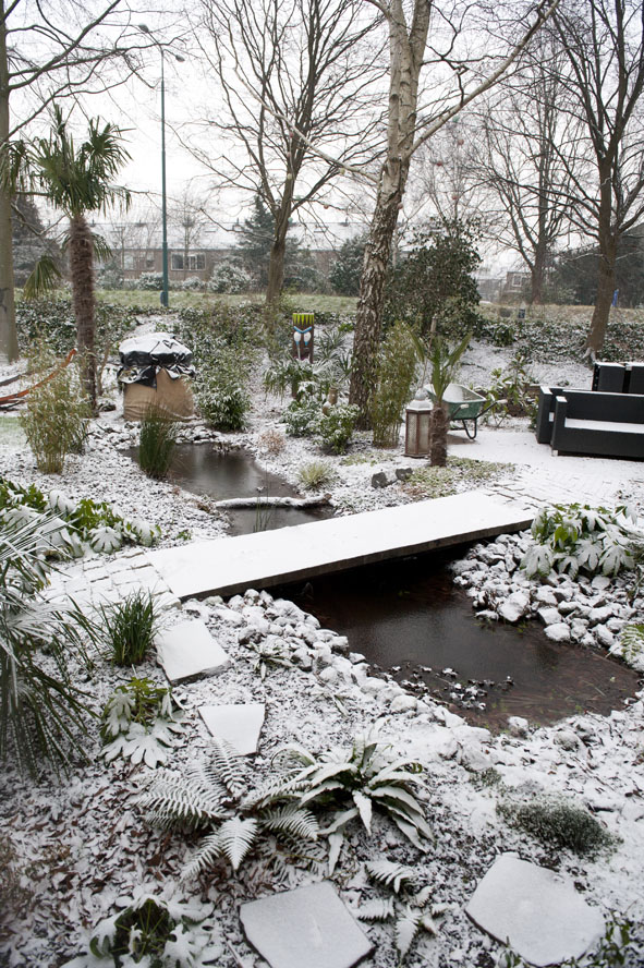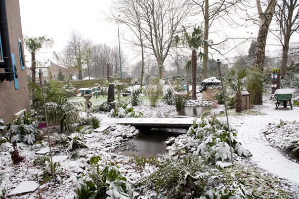 klopt er ligt nu ongeveer 5cm sneeuw en het heeft 12 graden gevroren vannacht dus de vijver is dicht gevroren