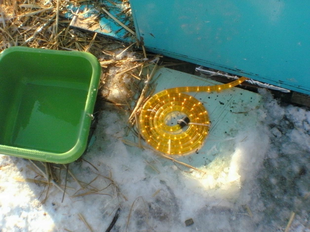 super , weer iets bij geleerd, de drinkbak op een lichtslang leggen;toch beter dan 3 keer per dag buiten in de kou vers warm water te geven